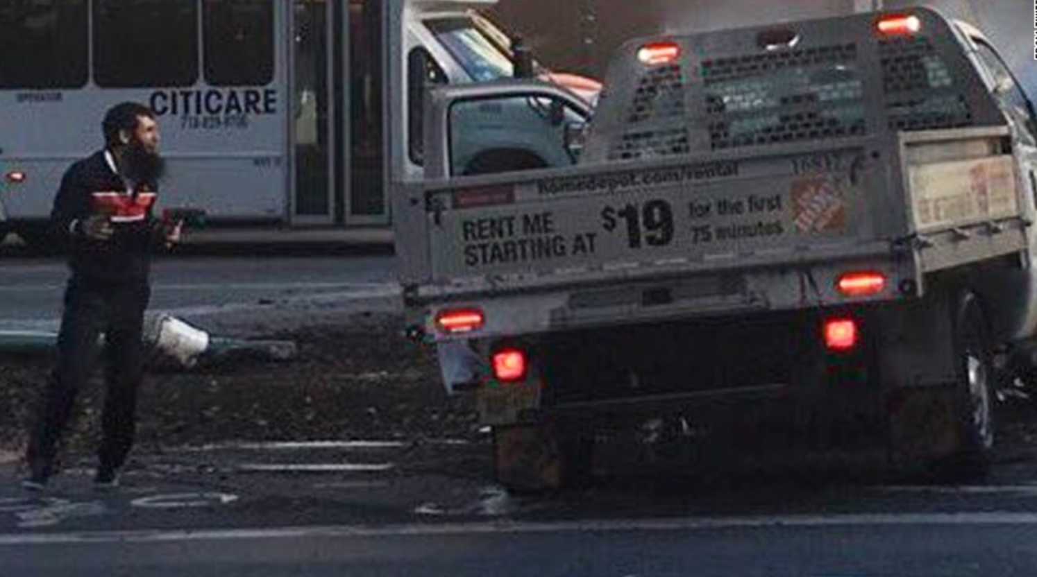 Ο ύποπτος χειρουργήθηκε μετά τον τραυματισμό του Σύμφωνα με πολλά αμερικανικά μέσα ενημέρωσης, επρόκειτο για τον Σαϊφούλο Σαΐποφ, κάτοικο του Νιού Τζέρσεϊ, όπου είχε νοικιαστεί το φορτηγάκι. Διέθετε άδεια μόνιμης παραμονής στις ΗΠΑ, τη λεγόμενη «πράσινη κάρτα», και δούλευε ως οδηγός για την Uber, σύμφωνα με την εφημερίδα New York Times, η οποία διευκρίνισε πως ο άνδρας βρισκόταν ήδη «στο ραντάρ» της αστυνομίας. Η αστυνομία γνωστοποίησε ότι ο άνδρας τραυματίστηκε από σφαίρες ανδρών της στην κοιλιακή χώρα και εισήχθη σε νοσοκομείο. Σύμφωνα με πολλά ΜΜΕ, χειρουργήθηκε το βράδυ και η πρόγνωση είναι ότι θα επιζήσει. Πολλοί ευρωπαίοι ηγέτες, ανάμεσά τους ο πρόεδρος της Γαλλίας Εμανουέλ Μακρόν και η πρωθυπουργός της Βρετανίας Τερέζα Μέι, εξέφρασαν την αλληλεγγύη τους στις ΗΠΑ. Η επίθεση έγινε λίγο μετά τις 15:00 τοπική ώρα (21:00 ώρα Ελλάδας), κατά μήκος του ποταμού Χάντσον, όπου βρισκόταν πλήθος ανθρώπων, αρκετοί από τους οποίους φορούσαν ήδη μεταμφιέσεις για να γιορτάσουν το Χάλογουιν.