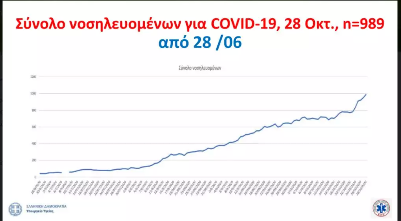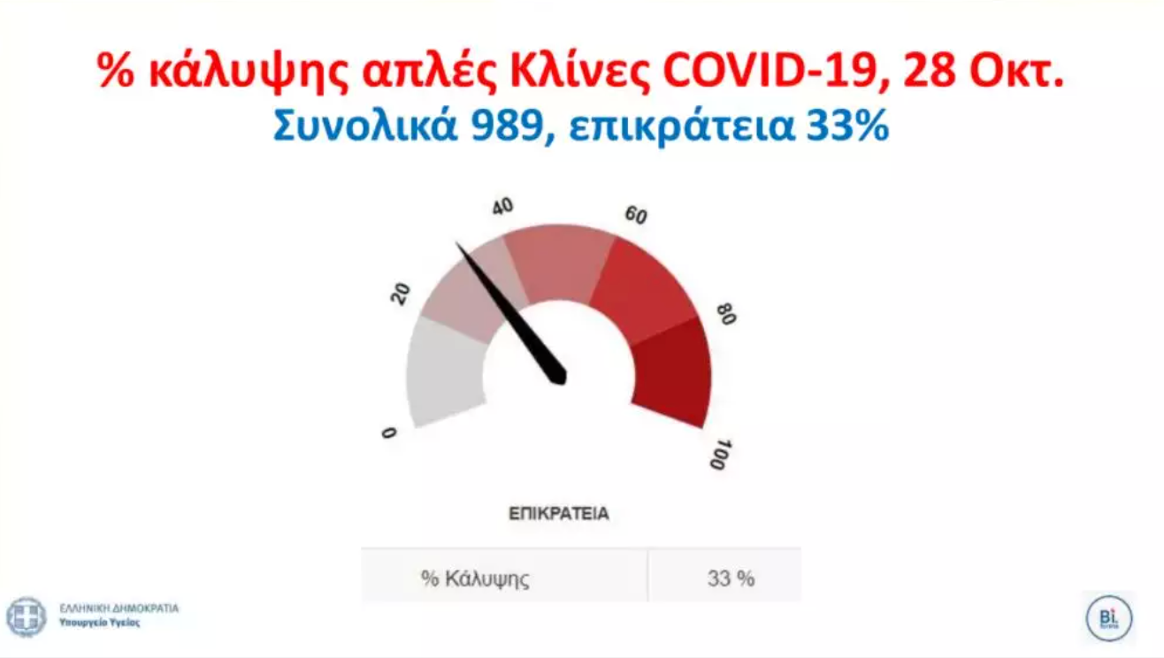 Στις 28 Οκτωβρίου, η κάλυψη των απλών κλινών CoViD-19 βρισκόταν στο 33%. Στις κλινικές CoViD-19 γίνονται περίπου 95 εισαγωγές ασθενών σε ημερήσια βάση, ενώ 137 ασθενείς νοσηλεύονται σε ΜΕΘ.