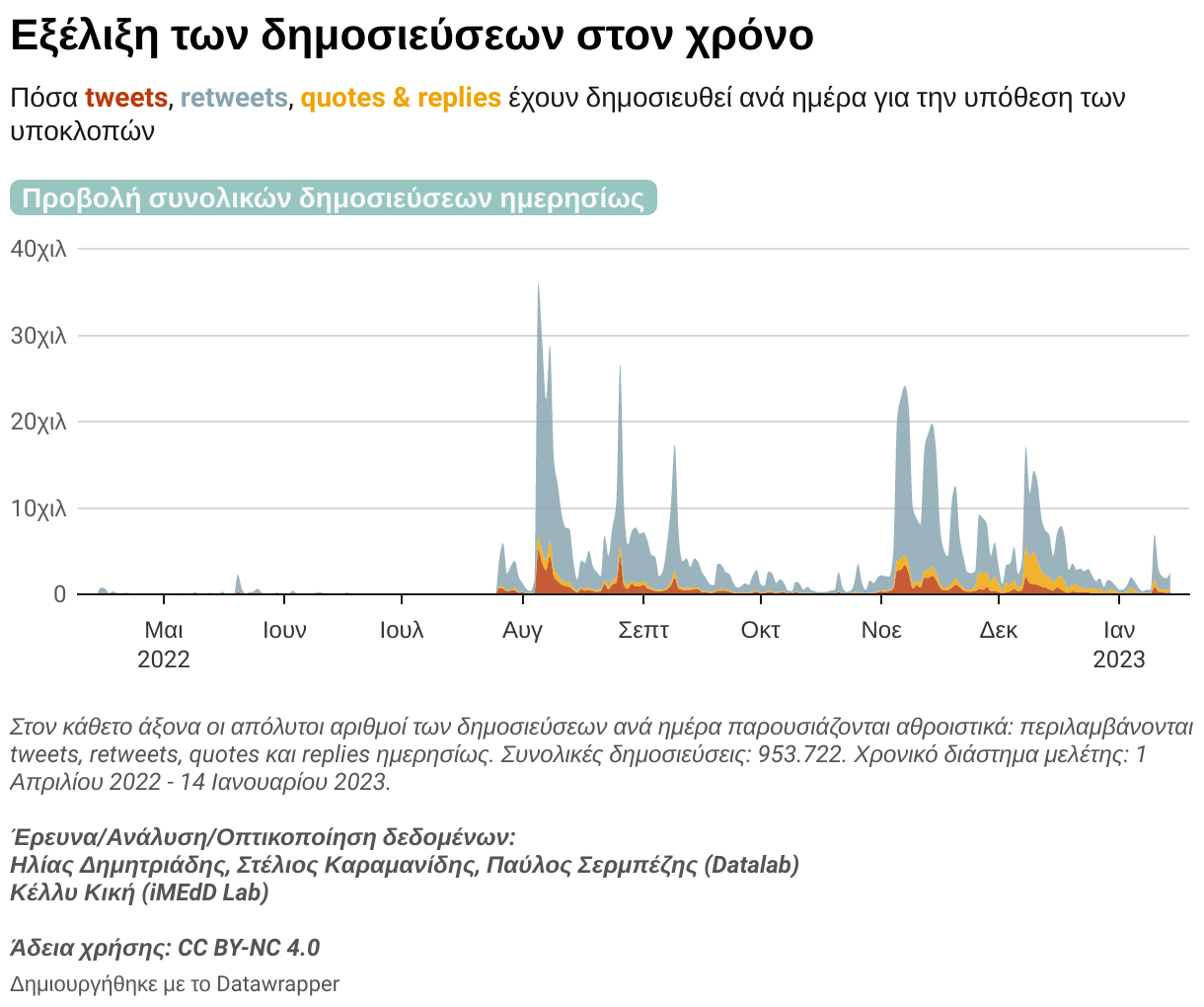 Με αφορμή τις δημοσιογραφικές αποκαλύψεις για την υπόθεση των υποκλοπών, το iMEdD Lab και το Datalab του Τμήματος Πληροφορικής στο Αριστοτέλειο Πανεπιστήμιο Θεσσαλονίκης παρουσιάζουν μια ερευνητική συνέργεια, με αντικείμενο την ανάλυση του διαλόγου για τις υποκλοπές στο Twitter. Η έρευνα με τίτλο «Υποκλοπές στο Twitter – Η εξέλιξη της συζήτησης τους τελευταίους εννέα μήνες, η πόλωση και ο ρόλος των media» άρχισε τον Νοέμβριο 2022 και εκπονήθηκε αναδρομικά, με το χρονικό διάστημα μελέτης να ξεκινά την 1η Απριλίου 2022 και να εκτείνεται μέχρι το τέλος του έτους.