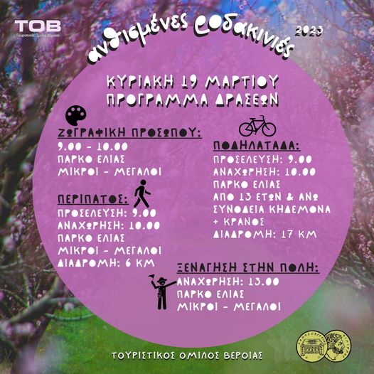 Αύριο 19/3, οι δράσεις του ΤΟΒ ξεκινούν στις εννέα το πρωί με ζωγραφική προσώπου στο πάρκο Ελιάς, από όπου και μία ώρα αργότερα θα γίνει η αναχώρηση, για την περίφημη ποδηλατάδα κατά μήκος των Ανθισμένων Ροδακινιών. Η συνολική διαδρομή είναι 17 χλμ. ενώ η υψομετρική διαφορά φτάνει τα 120 μ. Με βάση το πρόγραμμα, οι συμμετέχοντες, ξεκινώντας από το πάρκο Ελιάς, θα κατηφορίσουν προς τον οικισμό της Μέσης, θα ακολουθήσουν το δρόμο για Κουλούρα, συνεχίζοντας προς το χωριό Άμμος. Θα υπάρξει στάση για νερό και κολατσιό, πριν πάρουν το δρόμο της επιστροφής για τη Βέροια.