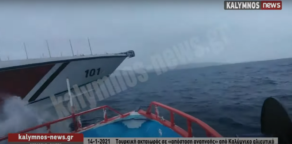 Το μεσημέρι της Πέμπτης, η τουρκική ακταιωρός με στοιχεία «101», αναπτύσσοντας μεγάλη ταχύτητα και με επικίνδυνους ελιγμούς, πλησίασε καλύμνιο αλιευτικό σε «απόσταση αναπνοής» από την πλώρη του. Ακολουθεί περιπολικό σκάφος του ΛΣ-ΕΛ.ΑΚΤ, που προσπαθεί να εκδιώξει την τουρκική ακταιωρό.