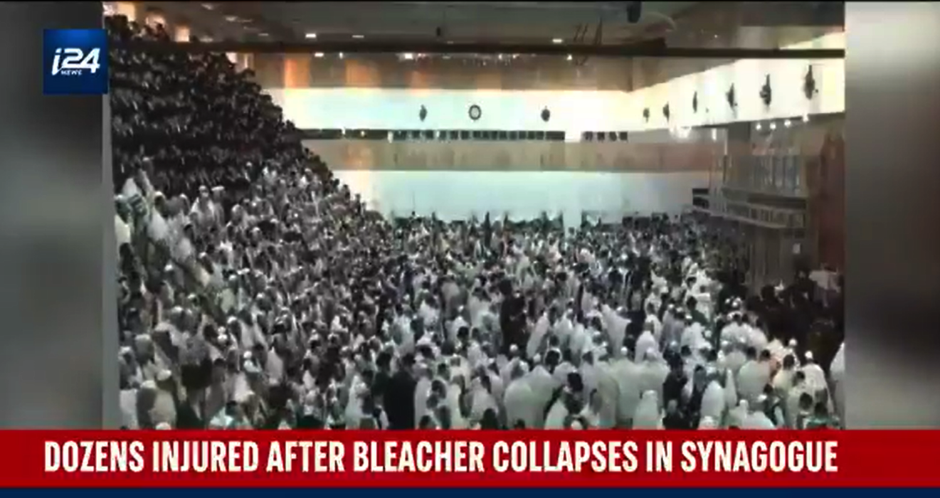 Εικόνες από κάμερες ασφαλείας που προβλήθηκαν στο Channel 12 έδειχναν μια γεμάτη από πιστούς εξέδρα να καταρρέει και οι άνθρωποι να πέφτουν ο ένας πάνω στον άλλο.