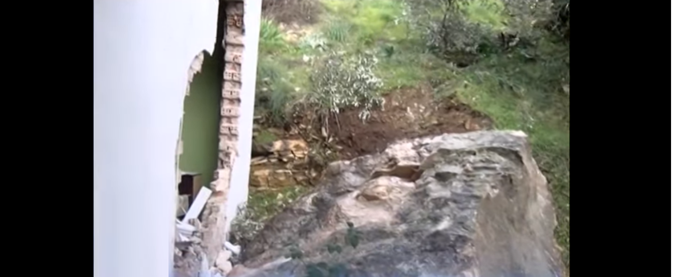Ο βράχος χτύπησε με δύναμη τον τοίχο του σπιτιού, την ώρα που μέσα βρίσκονταν μια γυναίκα με τον γιό της, ευτυχώς από την αντίθετη πλευρά, στην κουζίνα. Ο τοίχος κατέρρευσε και προκλήθηκαν ζημίες στα δωμάτια.