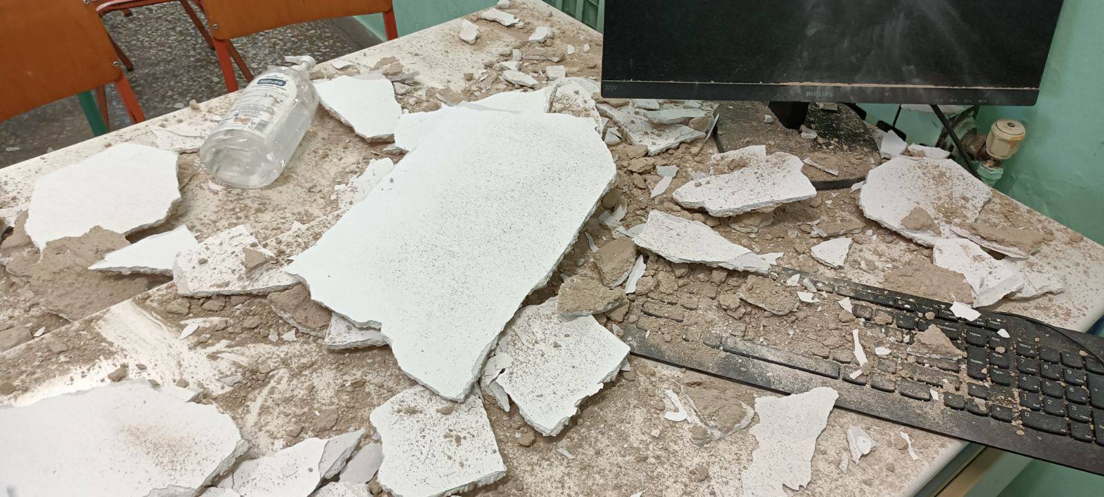 Το περιστατικό συνέβη 18ο Δημοτικό σχολείο. Οι εικόνες από τη σχολική αίθουσα σήμερα με τα κομμάτια από το ταβάνι τάξης του σχολείου που έπεσαν πάνω στο γραφείο και τα θρανία…