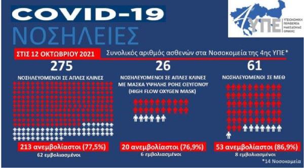 Σύμφωνα με τα στοιχεία της 4ης ΥΠΕ στα νοσοκομεία της Β. Ελλάδας νοσηλεύονται σε απλές κλίνες 275 ασθενείς, με το 77,5% να είναι ανεμβολίαστοι.
