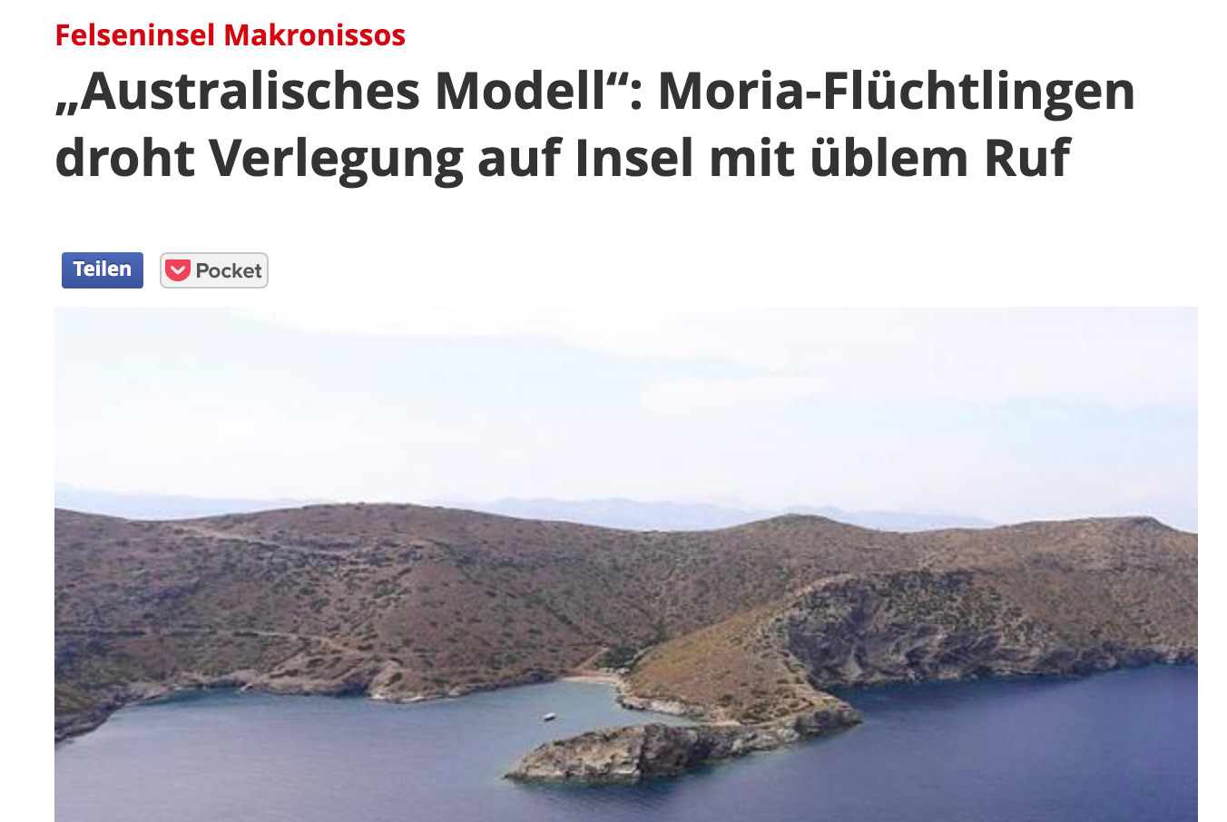 Βραχονησίδα Μακρόνησος, Εδώ και μήνες υπάρχουν όλο και πιο έντονες φωνές στο κυβερνών κόμμα της Νέας Δημοκρατίας που έχουν προτείνει ένα «αυστραλιανό μοντέλο» για την Ελλάδα. Τώρα αυτές μοιάζει να δυναμώνουν. Υπάρχει δημόσια συζήτηση για «βραχονησίδες» ή «ακατοίκητα νησιά του δυτικού Αιγαίου που βρίσκονται κοντά στην ηπειρωτική χώρα», τα οποία θα μπορούσαν να χρησιμοποιηθούν για τη δημιουργία ενός μεγάλου, απομονωμένου καταυλισμού.
