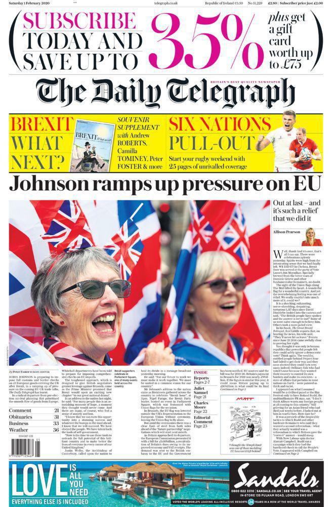 Η ταμπλόιντ Daily Express χαιρετίζει «ένα νέο ένδοξο Ηνωμένο Βασίλειο», αφού αποχώρησε από την ΕΕ έπειτα από 47 χρόνια ταραγμένου γάμου και τρεις αναβολές. «Το Brexit έγινε», γράφει στον ιστότοπό της η Daily Mail, ενώ η Daily Telegraph, που τάσσεται υπέρ του Brexit και του πρωθυπουργού Μπόρις Τζόνσον, παρουσίασε τα σχέδια του Βρετανού πρωθυπουργού για την επιβολή τελωνειακών ελέγχων στα ευρωπαϊκά προϊόντα και σχολιάζει στο κεντρικό της άρθρο: «Συγχαρητήρια βρετανικέ λαέ, επιτέλους εκτός». Όμως πολλές εφημερίδες αναρωτιούνται για τη συνέχεια, αναφερόμενες και στον διχασμό που εξακολουθεί να επικρατεί στη χώρα.