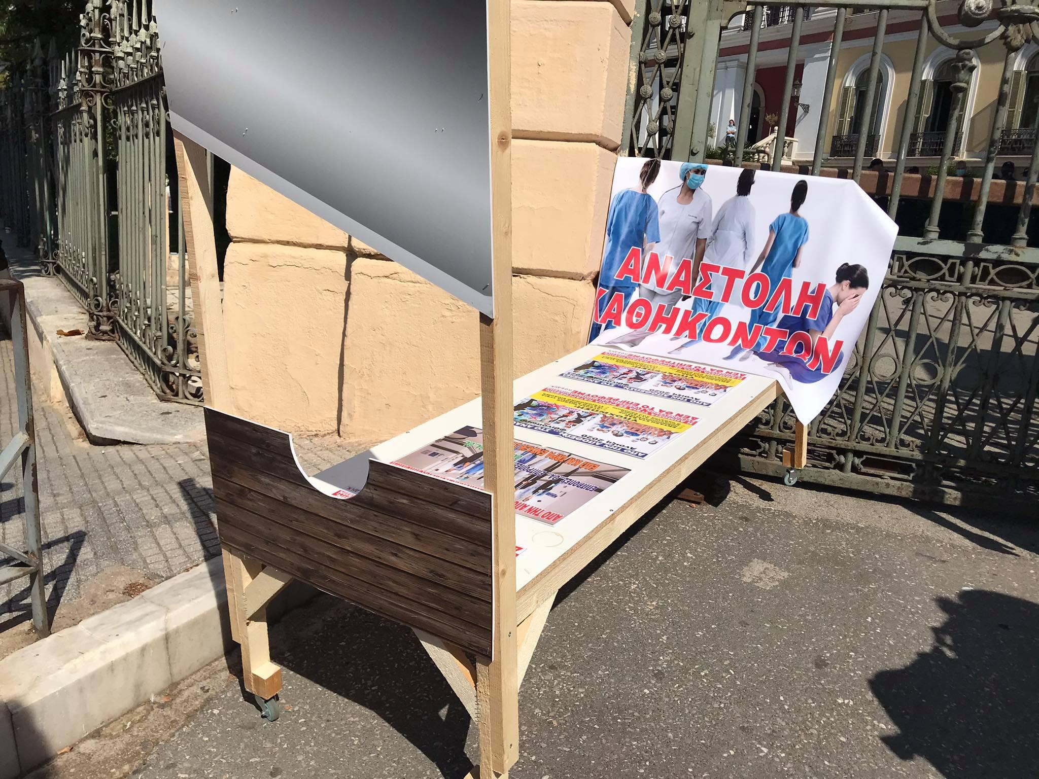Παράλληλα, τίμησαν την μνήμη τους 27 συναδέλφους τους που έφυγαν από κορονοϊό, απλώνοντας ισάριθμα τριαντάφυλλα στην πύλη του ΥΜΑΘ.