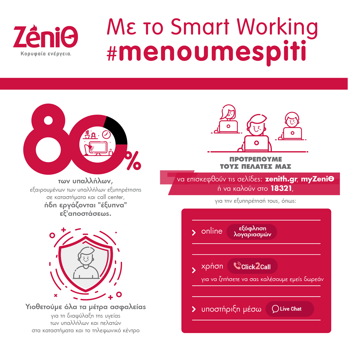 H ΖeniΘ, ο 1 ος πάροχος ολοκληρωμένης ενέργειας στην Ελλάδα, διοχετεύει όλη την ενέργειά της στην προστασία των υπαλλήλων και των πελατών της, καθώς και της κοινωνίας, εφαρμόζοντας ένα σύστημα “smart working” για εργασία εξ αποστάσεως, προκειμένου να συνδράμει στην εθνική προσπάθεια για τον περιορισμό της εξάπλωσης του ιού COVID-19 στη χώρα. Αυτή τη στιγμή, 80% των εργαζομένων μας, εξαιρουμένων των υπαλλήλων εξυπηρέτησης σε καταστήματα και τηλεφωνικά κέντρα, εργάζονται εξ αποστάσεως, με στόχο να αγγίξουμε το 100% μέχρι το τέλος της εβδομάδας.