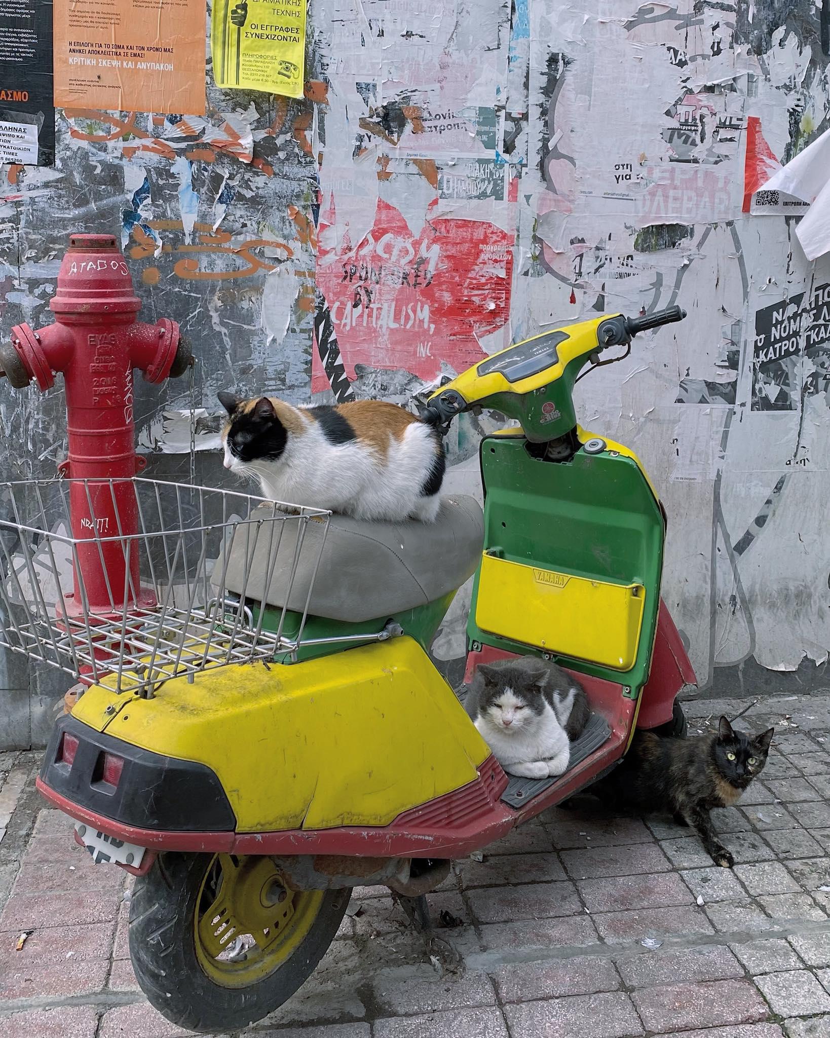 Την ξέχασε μία μέρα κάποιος στην Παπαμάρκου, βαμμένη στα χρώματα της Τζαμαϊκάς, χωρίς πινακίδες, με φουσκωμένα τα λάστιχα. Στέκεται κάθε μέρα εκεί, έχει ζήσει πολλά, έχει δει πολλές πόλεις, έχουν ανέβει πάνω της δυο σώματα ερωτευμένα και αγκαλιασμένα, έχει κουβαλήσει τα λαχανικά από την λαϊκή του Σαββάτου και εκείνα έχουν ποτίσει με αρώματα το καλάθι της. Ήταν σημαντική για εκείνον που την άφησε, της υποσχέθηκε πως θα ξαναγυρίσει, μα τώρα βρήκε αλλού την συντροφιά. Οι αδέσποτες γάτες της γειτονιάς την έχουν μετατρέψει σε διώροφη κατοικία κι έτσι η παρατημένη βέσπα άλλαξε όρους χρήσης, περιμένοντας.