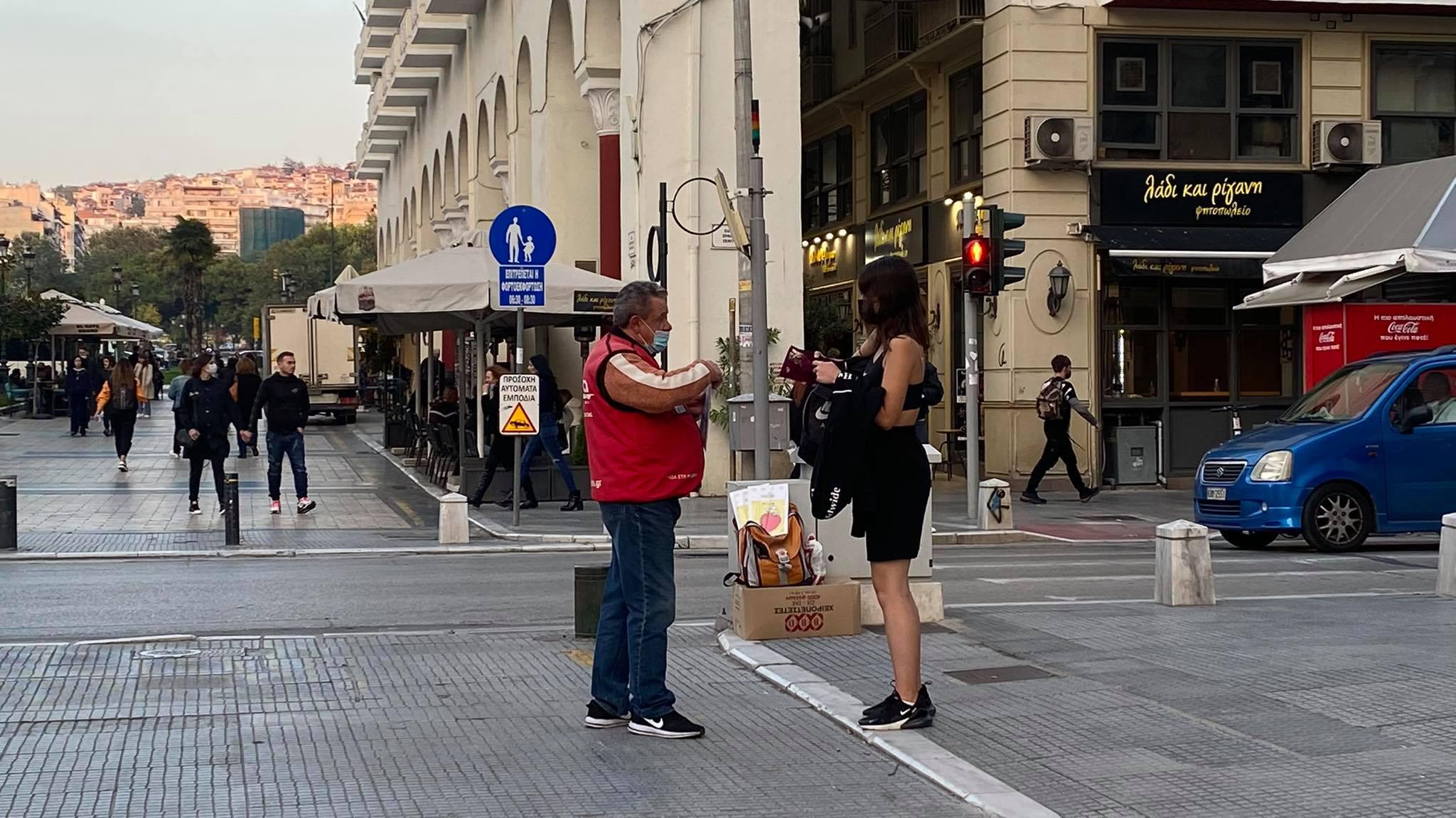 Φορούσε κόκκινο γιλέκο, της Σχεδίας, ηρωικό, και καθόταν σιωπηλός με την μάσκα του στην πλατεία Αριστοτέλους. Κανείς δεν του έδινε σημασία, κάποιοι του χαμογελούσαν, άλλοι τον αγνοούσαν, μέχρι που βρέθηκε μία κοπέλα γύρω στα 15. Τον πλησίασε, και τον ρώτησε τι ακριβώς κάνει, εκείνος με τα γελαστά του μάτια της εξήγησε την ιστορία της σχεδίας, εκείνη δεν όμως δεν γνώριζε τίποτε, άνοιξε την τσάντα της να βγάλει το πορτοφόλι της. Εκείνος, την ευχαρίστησε χίλιες φορές, η μικρή του είπε ”εγώ σας ευχαριστώ μου φτιάξατε την ημέρα.” Προβληματισμένη φαινόταν και μ’ένα μικρό παράπονο του είπε ”που να το βάλω όμως το περιοδικό δεν χωράει στο σακίδιο μου”, εκείνος την ρώτησε αν χρειάζεται βοήθεια, ανοίξανε μαζί την τσάντα και τοποθέτησαν την Σχεδία προσεκτικά για να μην τσαλακωθεί. Το κορίτσι φεύγοντας του είπε ”ελπίζω να σας ξαναδώ.” Κι εκείνος κούνησε συγκινημένος το χέρι.