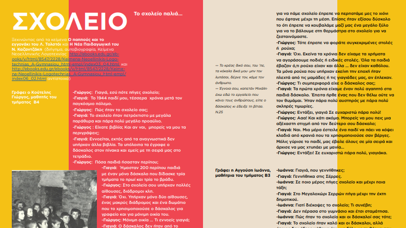 Στο τεύχος που έχει αναρτηθεί στην ιστοσελίδα του σχολείου φιλοξενούνται δείγματα δουλειάς από την περσινή και τη φετινή σχολική χρονιά, ενώ έχουν συμπεριληφθεί και κείμενα παιδιών που φοίτησαν παλιότερα στο σχολείο.