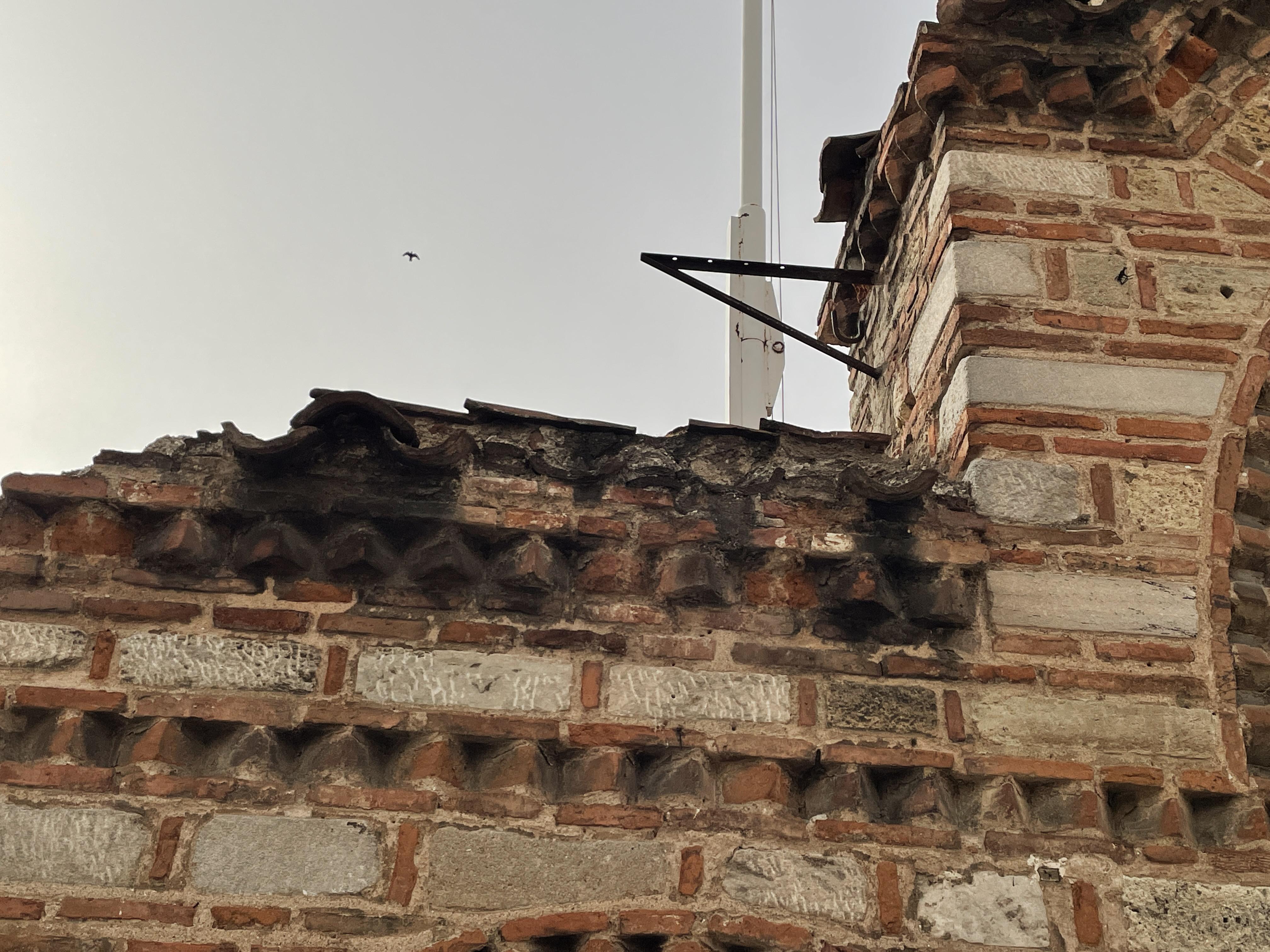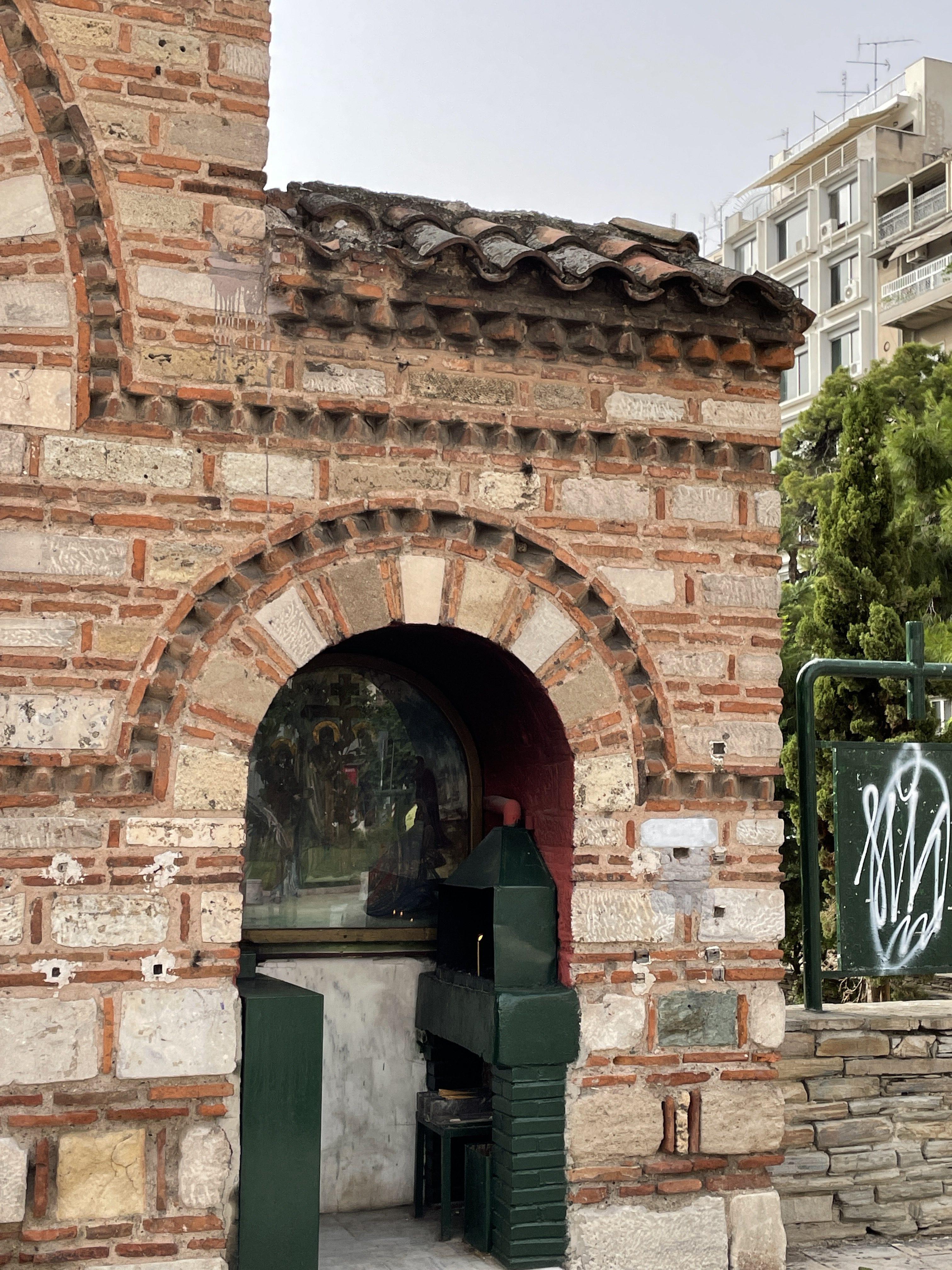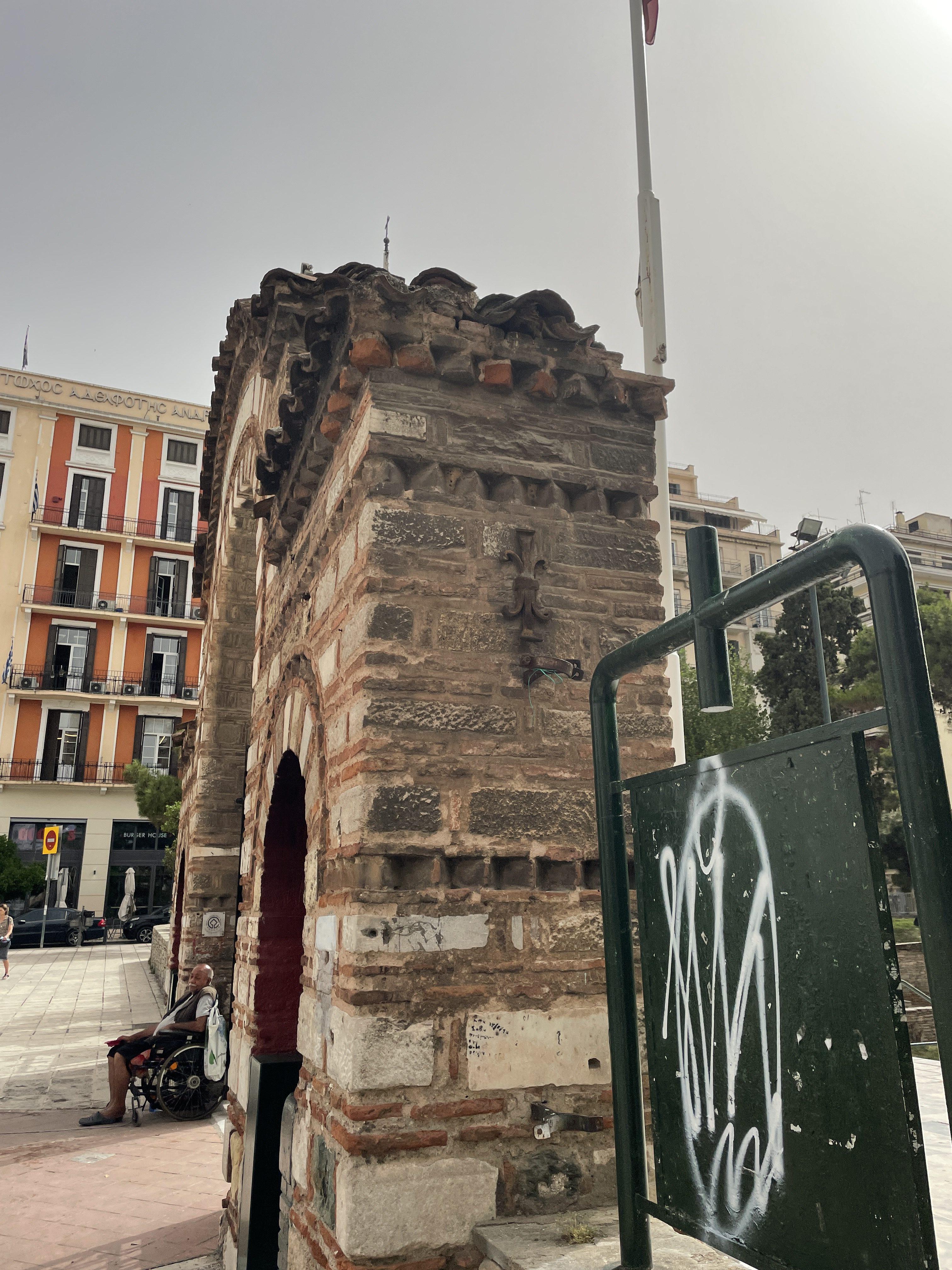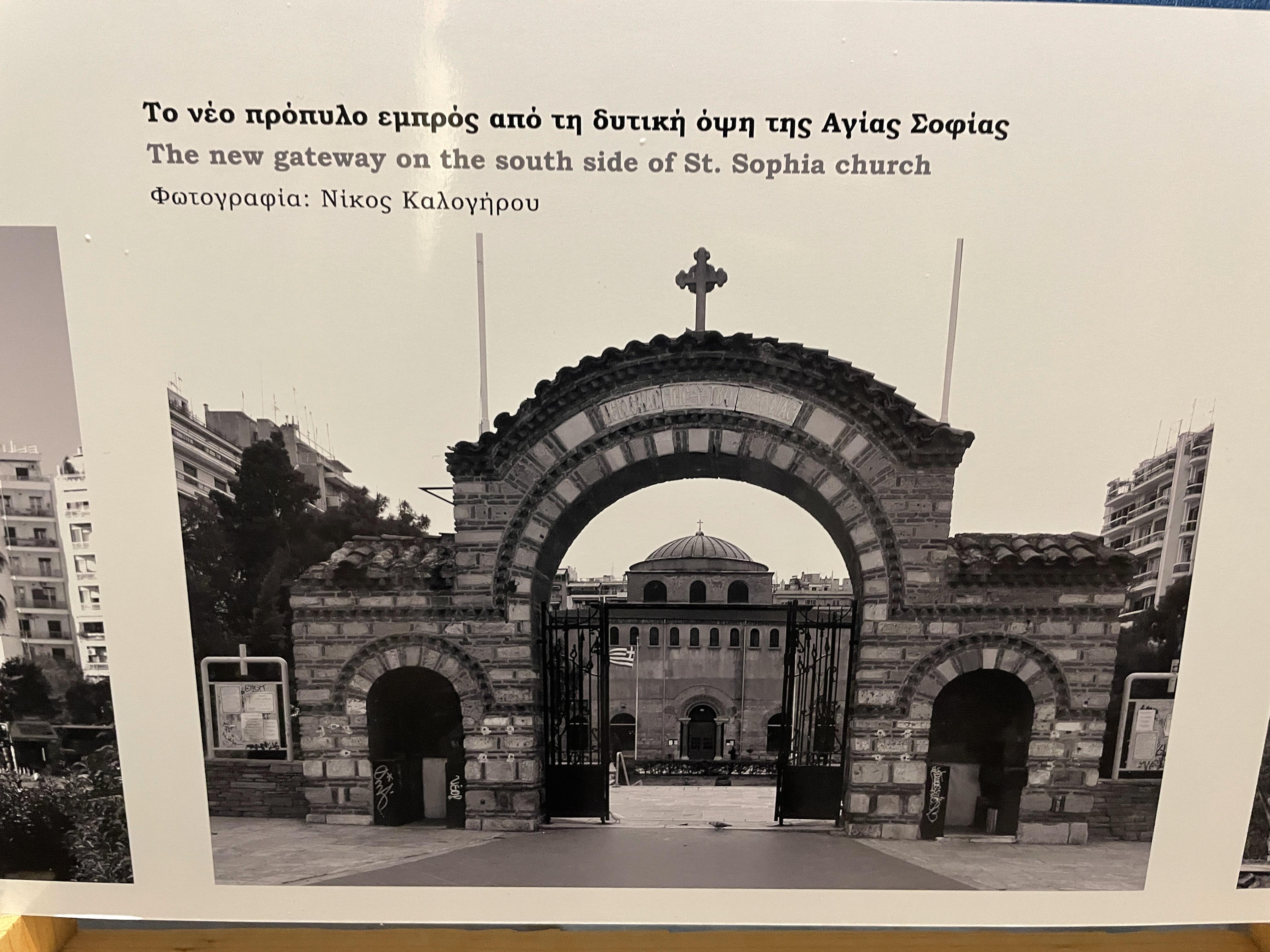 Καμένα κεραμίδια που διατηρούν μέχρι και σήμερα το μαύρο χρώμα του καπνού μαζεύτηκαν από τα γύρω σπίτια της συνοικίας της Αγίας Σοφίας από ενορίτες του ναού και τοποθετήθηκαν εκεί για να θυμίζουν στους περίοικους τα σπίτια εκείνα που βρίσκονταν περιμετρικά του ναού και στέγαζαν τις οικογένειες της παλιάς συνοικίας που σήμερα κρατά ελάχιστα από τα διατηρητέα της τα οποία και αυτά γίνανε με το χρόνο πολυκατοικίες και σχεδόν τίποτα από την Θεσσαλονίκη όπως ήταν πριν από 100 και πλέον χρόνια δεν θυμίζει η πλατεία η οποία παρ’όλα αυτά διατηρεί την μοναδικότητα της ως ένα σήμα κατατεθέν του κέντρου της πόλης.