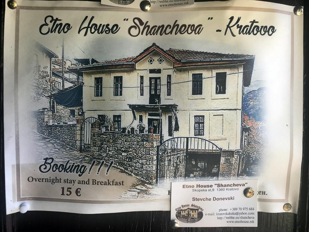 Στο Κράτοβο, ένα πανέμορφο ορεινό γραφικό χωριό, μόλις μια ώρα από την πόλη των Σκοπίων, ένας από τους κατοίκους του δημιούργησε λαογραφικό μουσείο που λειτουργεί παράλληλα ως ξενώνας (Airbnb), ιδιαίτερα δημοφιλής και αγαπητός σε όσους το έχουν επισκεφθεί. Το 2009, ο Stevce Donevski αγόρασε το 300 ετών σπίτι της οικογένειας Gurgincev, τα μέλη της οποίας ήταν έμποροι που πωλούσαν για χρόνια υφάσματα στην Θεσσαλονίκη και στο Ντουμπρόβνικ και το μετέτρεψε σε ένα πρότυπο λαογραφικό μουσείο που διαθέτει και ενοικιαζόμενο δωμάτια. Το όνομα του ο ξενώνας «Shancheva» το πήρε από την πρώτη ιδιοκτήτρια του σπιτιού, τη Shana.