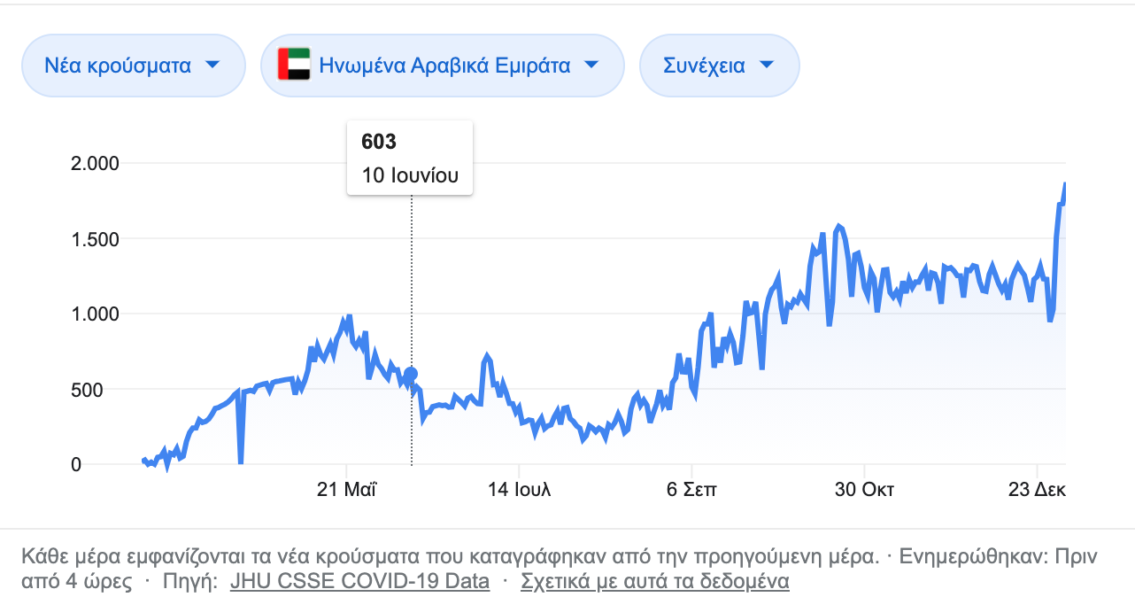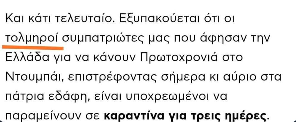 Η Πρωτοχρονιά στο Ντουμπάι των πλούσιων και διάσημων Ελλήνων, του αξιοθρήνητου ελληνικού σταρ σίστεμ, έγινε viral. Γιατί στο Ντουμπάι; Γιατί εκεί τα μέτρα είναι χαλαρά, η κυβέρνηση τους προσπαθεί πετυχημένα να συγκεντρώσει, όταν όλα είναι κλειστά στον υπόλοιπο πλανήτη, τον παγκόσμιο πλούτο, για τις γιορτές. Αδιαφορώντας για τις συνέπειες. Και ας υπάρχουν συνέπειες. Χθες ας πούμε 1η Ιανουαρίου, τα Εμιράτα σημείωσαν 1856 κρούσματα. Τα περισσότερα από την έναρξη της πανδημίας μέχρι σήμερα. Στις 27 Δεκεμβρίου η χώρα είχε 944 κρούσματα. Οι αφίξεις λοιπόν των γιορτών έκαναν τη δουλειά τους μια χαρά. Θυμάστε τι έγινε στην Ιταλία από κείνο το θέρετρο στις Άλπεις το Μάρτιο…