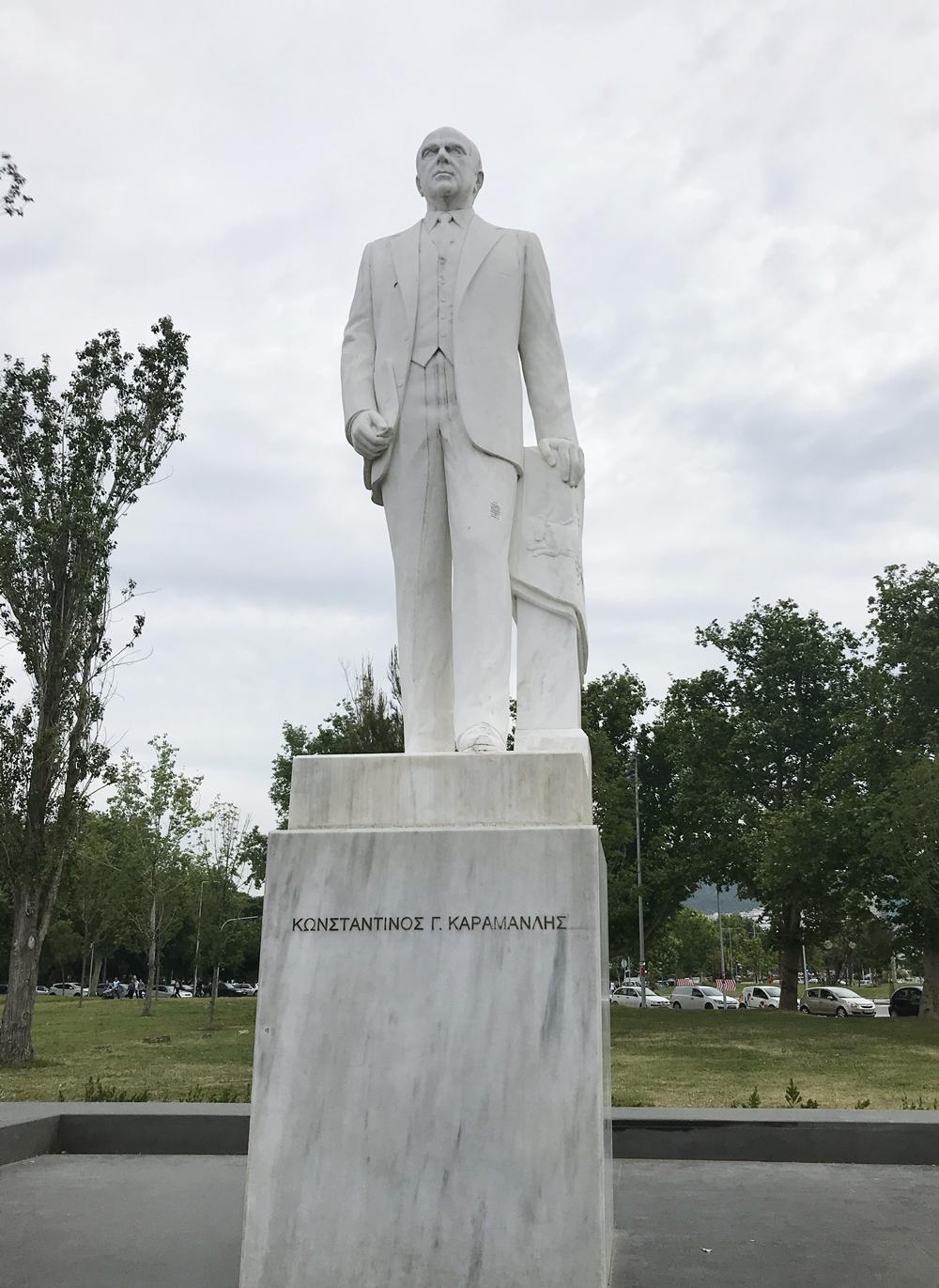 Ένα από τα πιο πρόσφατα αγάλματα στην πόλη, αυτό του Κωνσταντίνου Καραμανλή, δίχασε τους κατοίκους και υπήρξε η αφορμή για πολιτικές αντιπαραθέσεις σε τοπικό επίπεδο. Πρόκειται για ένα έργο του γλύπτη Πραξιτέλη Τζανουλίνου φτιαγμένο από λευκό μάρμαρο που απεικονίζει τον Κωνσταντίνο Καραμανλή σε όρθια στάση να ακουμπά το ένα χέρι του το έδρανο του κοινοβουλίου, στο οποίο διακρίνουμε την απεικόνιση του μύθου της αρπαγής της Ευρώπης. Στο άλλο χέρι κρατάει την συνθήκη ένταξης της Ελλάδος στην Ε.Ο.Κ., Τοποθετημένο σε ψηλό βάθρο (ίσως ψηλότερο από ότι θα έπρεπε), σε ένα περιβάλλον επίσης φτιαγμένο από λευκό μάρμαρο και μερικά σκαλοπάτια, βρίσκεται στο ύψος του Δημαρχείου στην νέα παραλία.