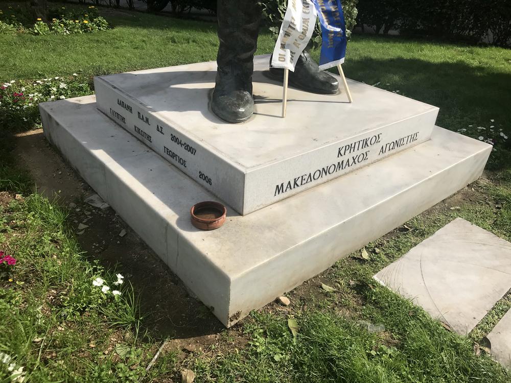 Ο γλύπτης Γεώργιος Κικώτης ήταν αυτός που το 2006 φιλοτέχνησε τον ανδριάντα του Κρητικού Μακεδονομάχου για την Παγκρήτια Αδελφότητα της Μακεδονίας. Βρίσκεται στην συμβολή των οδών Παύλου Μελά και Μητροπόλεως σε μια νησίδα στο τέλος της Γούναρη και ο φορέας ανάθεσης είναι ο Δήμος Θεσσαλονίκης. Είναι ένα χάλκινο μεγάλου διαμετρήματος άγαλμα ενός Κρητικού αγωνιστή, φοράει κρητική στολή και κρατάει στο ένα χέρι πιστόλι και στο άλλο ένα μαχαίρι.