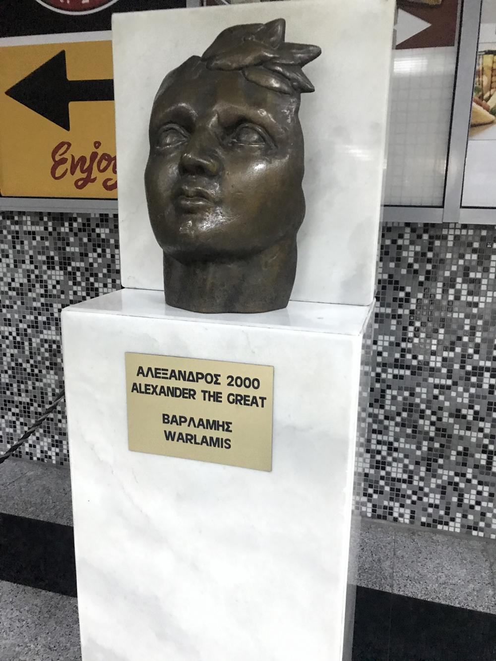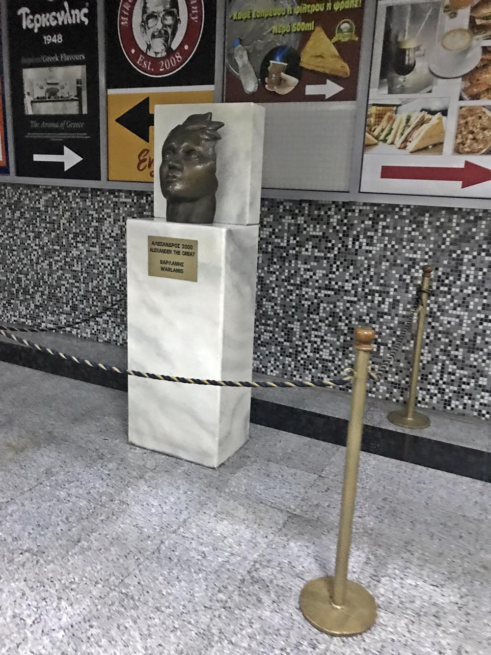 Μια προτομή του Μεγάλου Αλεξάνδρου καλωσορίζει τους επισκέπτες της Θεσσαλονίκης στον προθάλαμου της αίθουσας αφίξεων του ΟΣΕ.