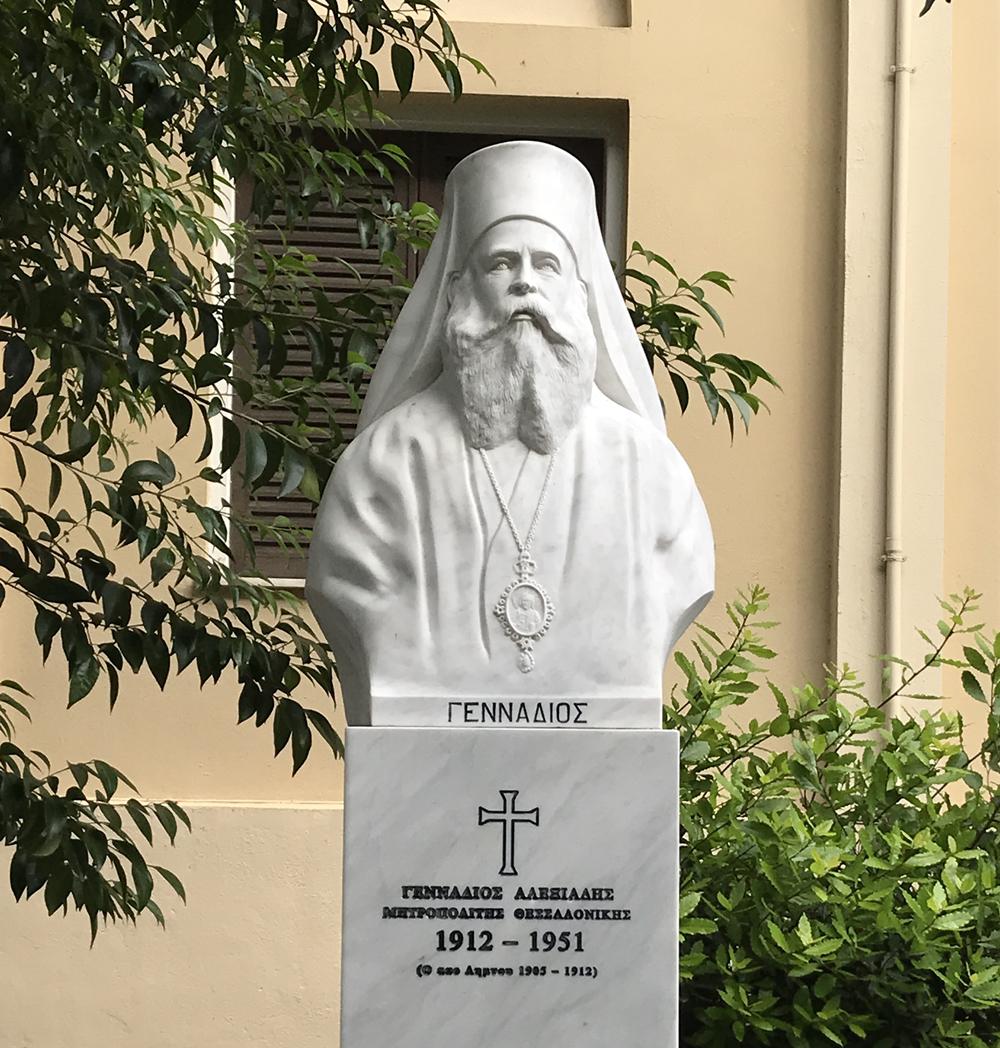 Ο Μητροπολίτης Θεσσαλονίκης Γεννάδιος γεννήθηκε στη Μεσόπολη Προύσας το 1868, ήταν Έλληνας θεολόγος και επίσκοπος. Διετέλεσε αρχικά Μητροπολίτης Λήμνου και επέδειξε σημαντική δράση για την παιδεία, τη φιλανθρωπία και τη νεότητα. Φοίτησε στην Ιερά Θεολογική Σχολή της Χάλκης, όπου έλαβε τον τίτλο του Διδασκάλου της Ορθόδοξης Θεολογίας το 1893. Συνέβαλε δυναμικά στην απελευθέρωση της Θεσσαλονίκης, αποτελώντας παράγοντα προς τις οθωμανικές αρχές για την παράδοση της πόλης στον ελληνικό στρατό χωρίς αντίσταση. Τέλεσε τη Δοξολογία για την απελευθέρωση της Θεσσαλονίκης στον Ναό του Αγίου Μηνά και ήταν πάντοτε παρών σε όλες τις τελετές υποδοχής των ελληνικών αρχών. Κατά τη διάρκεια της γερμανικής κατοχής της Θεσσαλονίκης έδωσε οδηγίες στους Χριστιανούς της πόλης να μην προβούν σε καμία διάκριση προς τους Εβραίους συμπολίτες τους, όταν οι τελευταίοι υποχρεώθηκαν από τις κατοχικές δυνάμεις να φορούν το κίτρινο άστρο, ενώ έκανε έντονα διαβήματα για να σταματήσουν οι εκτοπίσεις τους στα στρατόπεδα συγκέντρωσης. Για τη δράση του αυτή ανακηρύχθηκε – μετά θάνατον – το 1969 «Δικαίος των Εθνών» στο Ισραήλ, τίτλος που αποδίδεται σε όσους έσωσαν τη ζωή Εβραίων κατά την διάρκεια του πολέμου. Το όνομα του φέρει οδός της Θεσσαλονίκης που καταλήγει στην πλατεία Άθωνος.