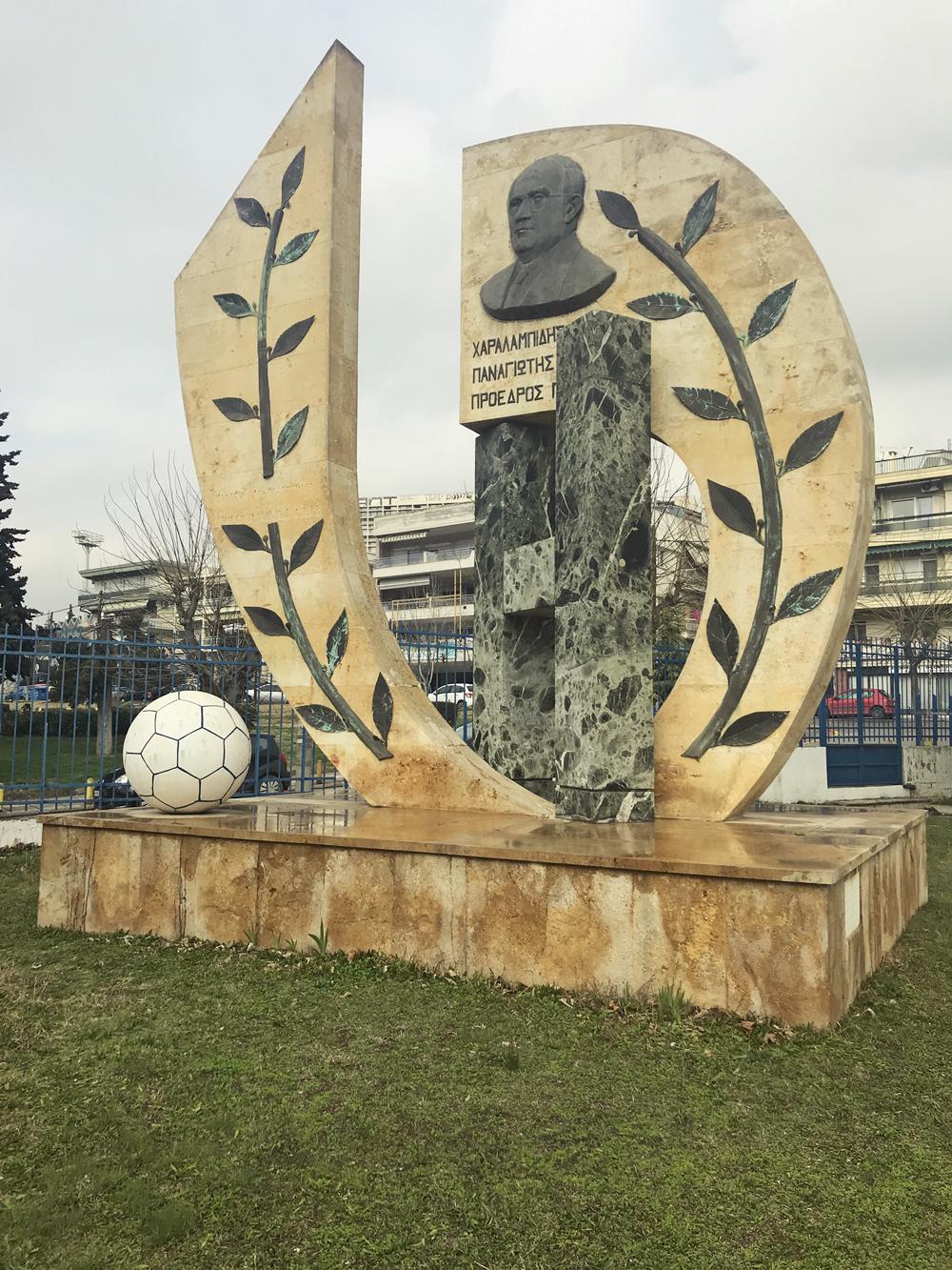 Το μνημείο είναι τοποθετημένο σε μαρμάρινη βάση περιτριγυρισμένο από γρασίδι. Το γεγονός ότι βρίσκεται εντός του γηπέδου κόβει την θέα προς αυτό και δεν το αναδεικνύει. Στην επιγραφή του αναφέρεται πως πρόκειται για μια ιδέα του Τάσου Κακογγιάννη που φιλοτέχνησε ο Καλεβράς και η κατασκευή του πραγματοποιήθηκε από το καλλιτεχνικό εργαστήριο μαρμάρου Φύλακτος.