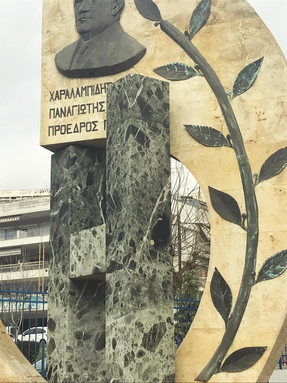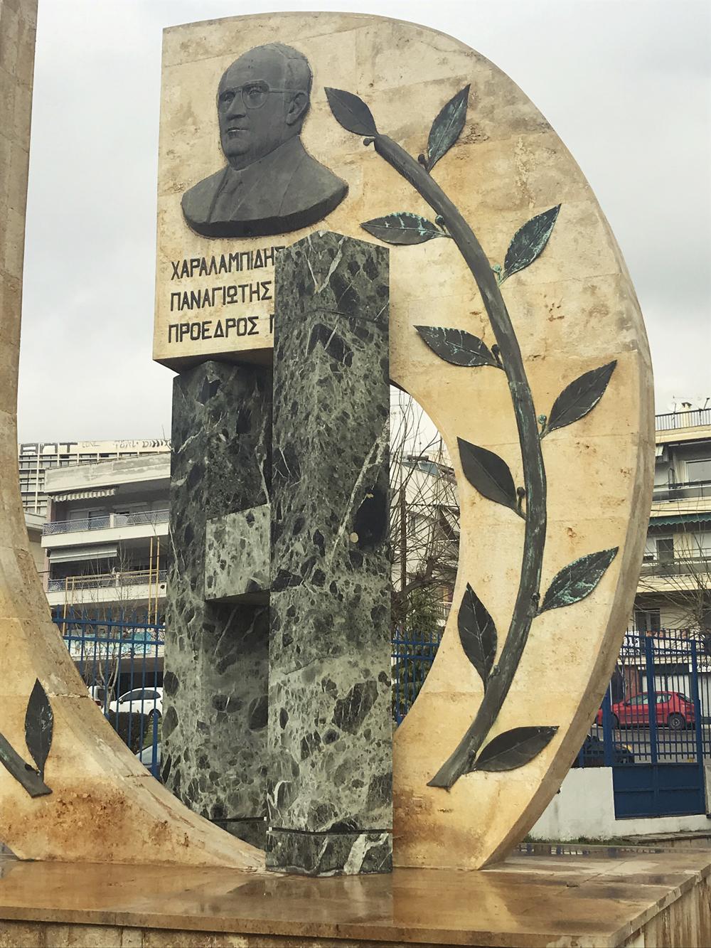 Αριστερά υπάρχει η μορφή του Χαραλαμπίδη και η αναφορά του τίτλου του προέδρου. Ο Παναγιώτης Χαραλαμπίδης, γεννημένος στις 18 Ιουλίου 1938 στην Θεσσαλονίκη, αγωνιζόταν σαν αμυντικός στην ομάδα του Ηρακλή Θεσσαλονίκης ενώ παράλληλα σπούδαζε Ιατρική. Αποκτήθηκε από την ΑΕΚ το καλοκαίρι του 1963. Κατέγραψε τρεις επίσημες συμμετοχές στο Πρωτάθλημα Ελλάδας της περιόδου 1963-64. Το καλοκαίρι του 1964 αποχώρησε από την ΑΕΚ, επέστρεψε και πάλι στην ομάδα του Ηρακλή Θεσσαλονίκης, στην οποία χρημάτισε και Πρόεδρος αρκετά χρόνια αργότερα.