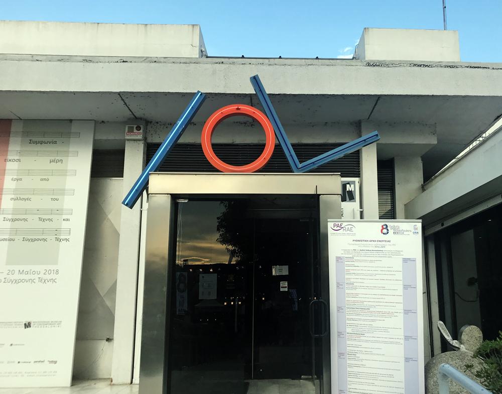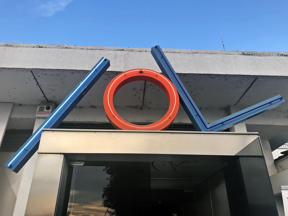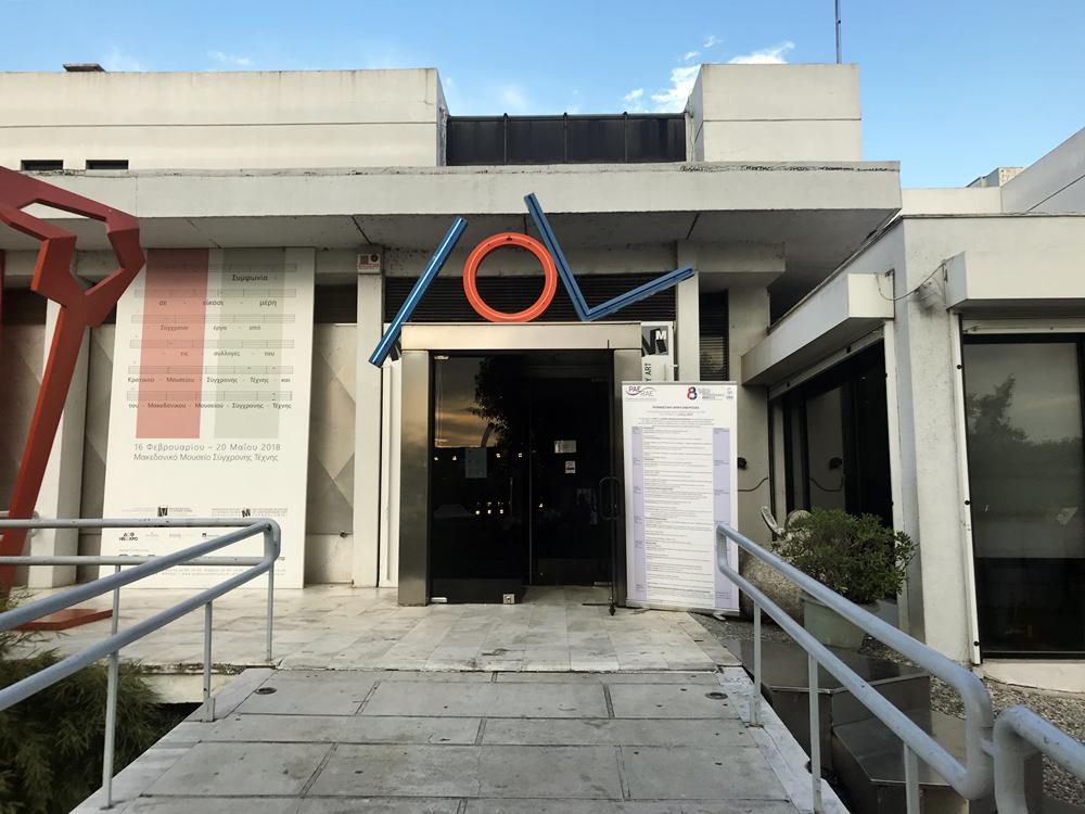 Ακριβώς επάνω από την κύρια είσοδο του MOMus - Μουσείου Σύγχρονης Τέχνης μας καλωσορίζει μια εγκατάσταση του γλύπτη Στήβεν Αντωνάκος με τον τίτλο «Τρία».