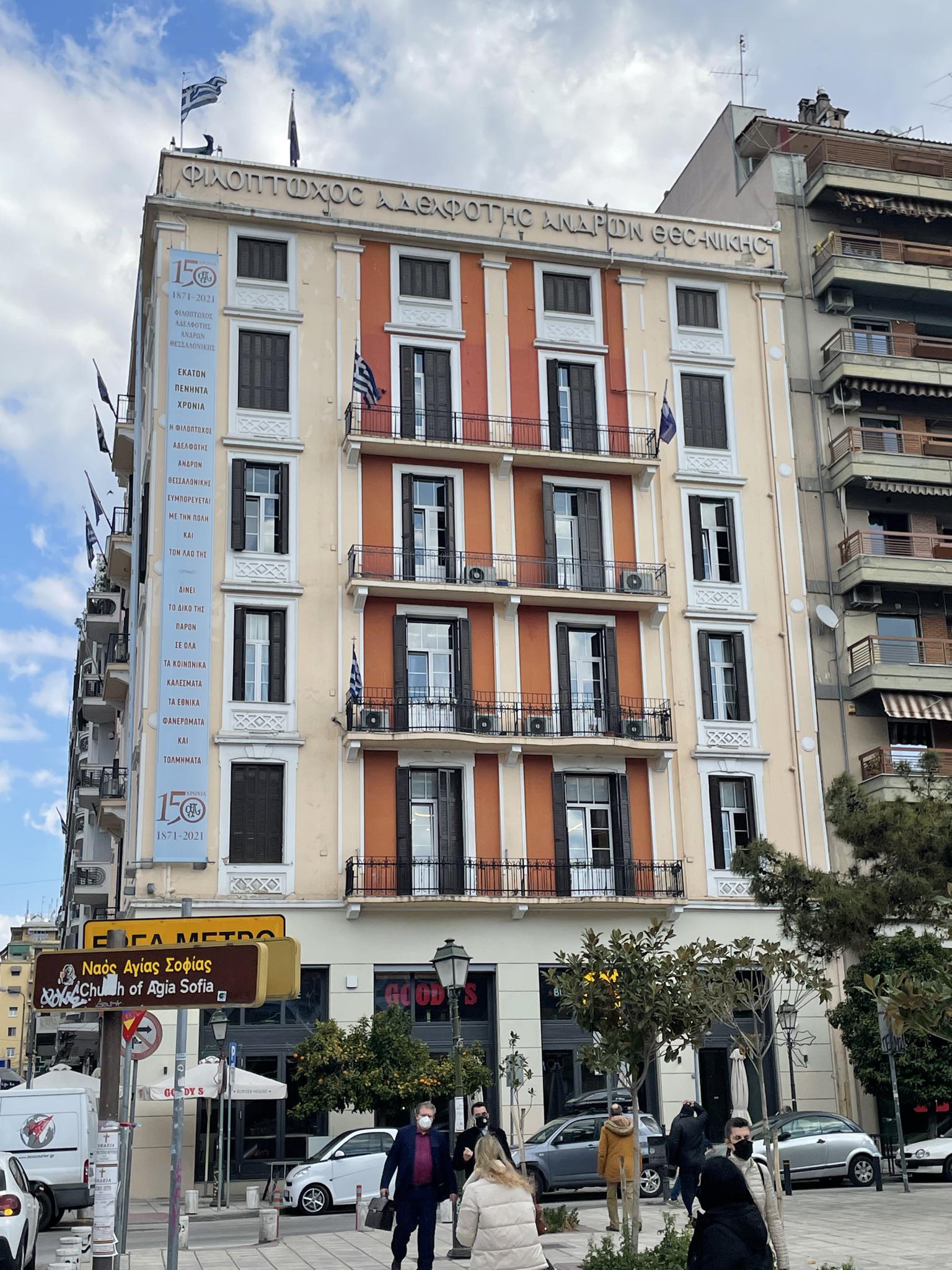 Το 1922 αγοράστηκε το οικόπεδο που βρίσκεται στη γωνία των οδών Αγ. Σοφίας και Κεραμοπούλου και ανήκε στην πυρίκαυστη ζώνη με έκταση 335.84 τ.μ. Το Μέγαρο της Φ.Α.Α.Θ έγινε σε σχέδια του σπουδαίου αρχιτέκτονα Ξενοφώντα Παιονίδη, συνυπογράφοντας σύμβαση με την Ανώνυμη Οικοδομική Εταιρεία Νέων Χωρών (η ίδια που είχε αναλάβει και το Κόκκινο Σπίτι που βρίσκεται ακριβώς απέναντι) έναντι 1.485.000 δραχμών.