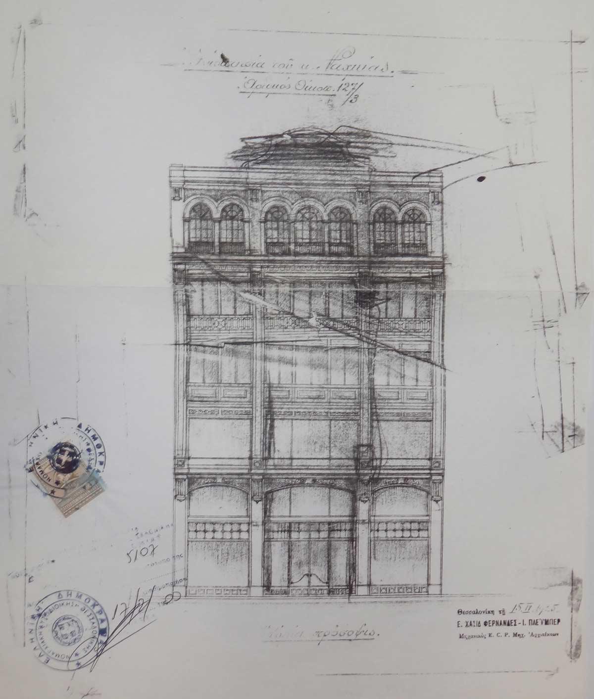 Το κτίριο ανήκει στον τύπο του μεσοπολεμικού μεγάρου και χτίστηκε σύμφωνα με το νέο πολεοδομικό σχέδιο που συντάχθηκε μετά την καταστροφική πυρκαγιά του 1917. Από τότε μέχρι σήμερα η κύρια όψη του “κοιτάει” στην προσφάτως τότε διανοιγμένη οδό Τσιμισκή (σημερινός αριθμός 13) και η δευτερεύουσα όψη στην οδό Αγίου Μηνά 16.