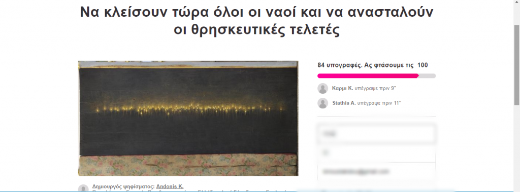 «Ανέβηκε» ψήφισμα στο Αvaaz.org, σύμφωνα με το οποίο καλούνται οι πολίτες να υπογράψουν για την αναστολή της λειτουργίας όλων των ναών και των θρησκευτικών τελετών λόγω της εξάπλωσης του κοροναϊού.