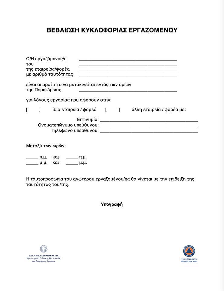 Για τις ανάγκες των περιορισμένων μετακινήσεων δημιουργούνται δυο τύποι εγγράφων. Το πρώτο, η βεβαίωση τύπου Α, αφορά τις μετακινήσεις των εργαζόμενων, συμπληρώνεται μια φορά και παρέχεται με προσωπική ευθύνη του υπογράφοντος από τον εργοδότη ή τον νόμιμο εκπρόσωπό του σε περίπτωση νομικού προσώπου ή, σε περίπτωση ελεύθερου επαγγελματία ή αυτοαπασχολούμενου, από τον ίδιο. Περιέχει το ονοματεπώνυμο, τον τόπο κατοικίας και τον τόπο εργασίας του εργαζόμενου, καθώς και το ωράριο προσέλευσης και αποχώρησής του. Ο εργαζόμενος τη φέρει υποχρεωτικά μαζί του κατά τις μετακινήσεις του προς και από την εργασία του.