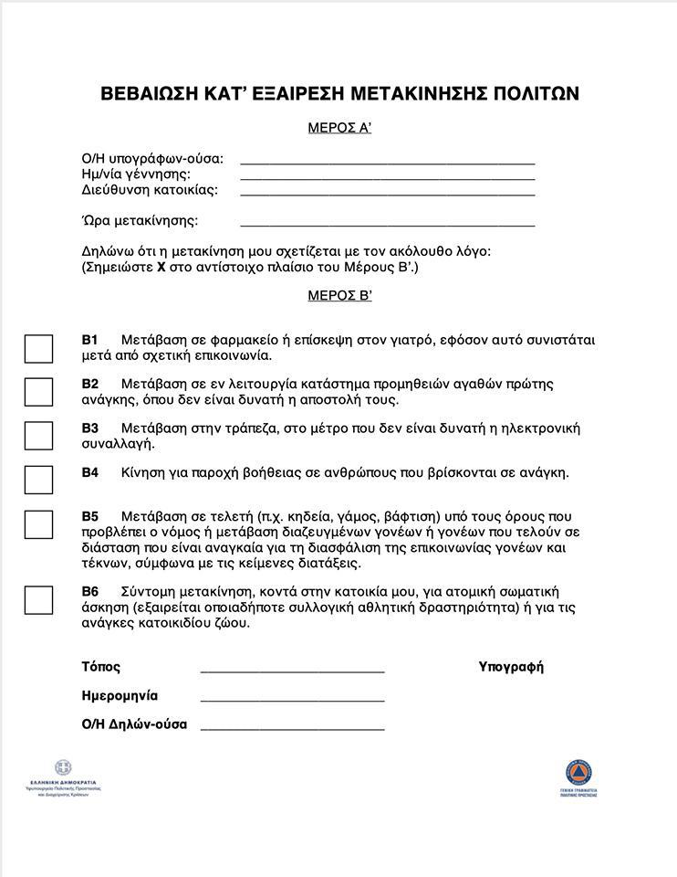 Για τις άλλες περιπτώσεις (μετάβαση σε σούπερ μάρκετ, φαρμακείο, τράπεζα κοκ) και για κάθε μεμονωμένη κίνηση οι πολίτες πρέπει να συμπληρώνουν κάθε φορά τη βεβαίωση τύπου Β με το ονοματεπώνυμο, τον τόπο κατοικίας και τον τόπο προορισμού του πολίτη, καθώς και τον συγκεκριμένο λόγο της μετακίνησης.