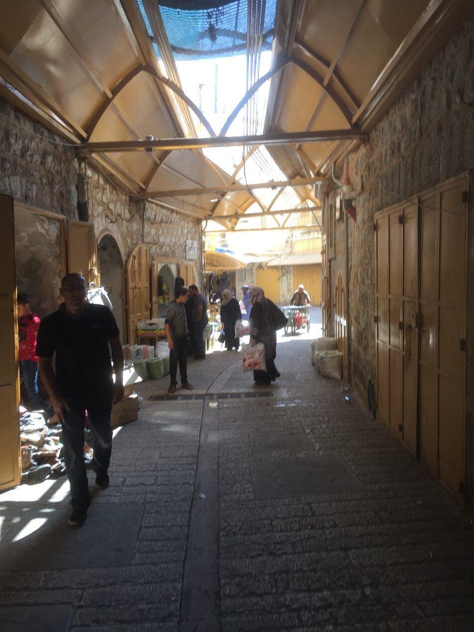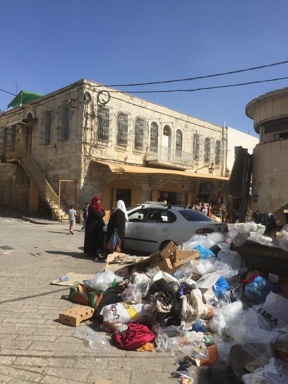 Προχωρώντας μέσα στα στενά είδαμε λιγοστές γυναίκες να έχουν βγει για τα ψώνια τους και μερικούς ηλικιωμένους να συνομιλούν κρατώντας συντροφιά ο ένας στον άλλο. Κυριαρχούσε μια αλλόκοτη ερημιά και μια νεκρική σιγή που άφηνε ένα τρομακτικό αποτύπωμα πάνω σου. Καθώς προχωρούσαμε κι άλλο, κοιτώντας πότε τις στοές και πότε τα τετραγωνισμένα από τις σιδεριές μπλε κομμάτια του ουρανού αντικρίζαμε τόνους σκουπιδιών σε κάθε γωνία. Κοιτώντας απορημένες τα τόσα απορρίμματα μας πλησίασε ένας ντόπιος και -ίσως από ντροπή- μας εξήγησε πως τους τα πετάνε κάθε μέρα οι Ισραηλινοί που κατοικούν στις οροφές των χαμηλών κτισμάτων. Εκείνοι σπεύδουν να τα μαζέψουν κάθε πρωί, όμως μέχρι το μεσημέρι η κατάσταση είναι πάλι η ίδια.