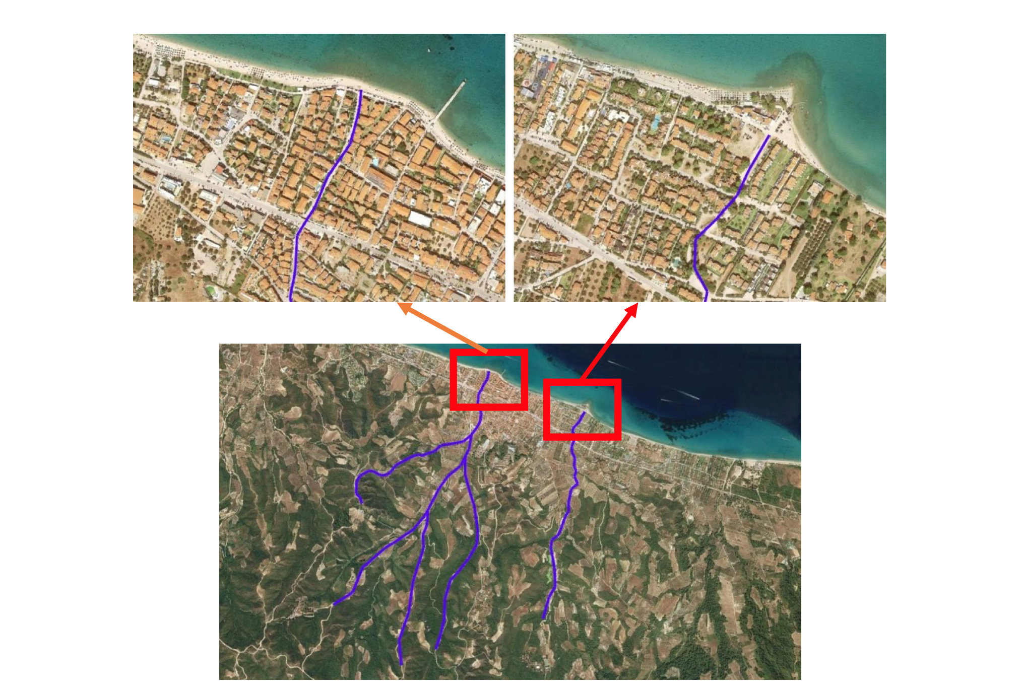 Τον οικισμό διασχίζουν δύο τουλάχιστον, αξιόλογα ρέματα με σημαντικές λεκάνες απορροής. Τα ρέματα αυτά φυσικά, στο τμήμα τους που διέρχεται μέσα από τον οικισμό είναι καταπατημένα και χρησιμοποιούνται, όπως συνηθίζεται σ’ αυτές τις περιπτώσεις ως δρόμοι, οδηγώντας αυτονόητα σε αυξημένο κίνδυνο πλημμύρας. Όπως φαίνεται στις παρακάτω εικόνες από το Google Earth, τα ρέματα είχαν δημιουργήσει, με την πάροδο του χρόνου, προσχώσεις στις εκβολές τους. Οι περιοχές αυτές όμως τα τελευταία χρόνια φθίνουν, καθώς ο φυσικό εμπλουτισμός της ακτής από φερτά υλικά από τη λεκάνη απορροής έχει διακοπεί. Το ίδιο σημαίνει και στα ενδιάμεσα τμήματα και αποτελεί έναν από τους λόγους απώλειας της ακτής.