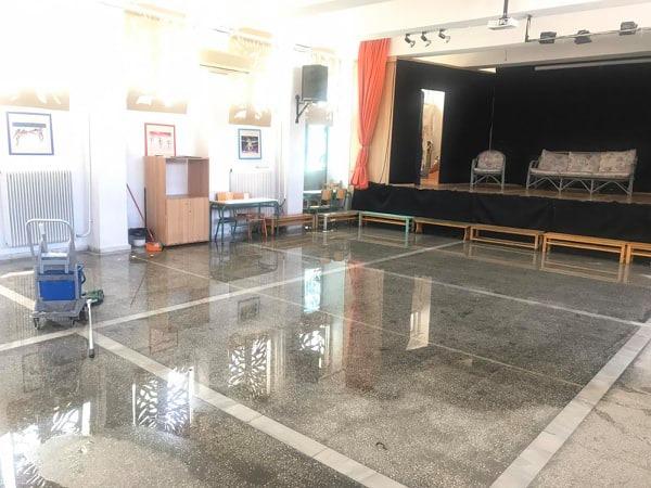 ( στη φωτό η πλημμυρισμένη αίθουσα πολλαπλών χρήσεων του 1ου Δημοτικού)