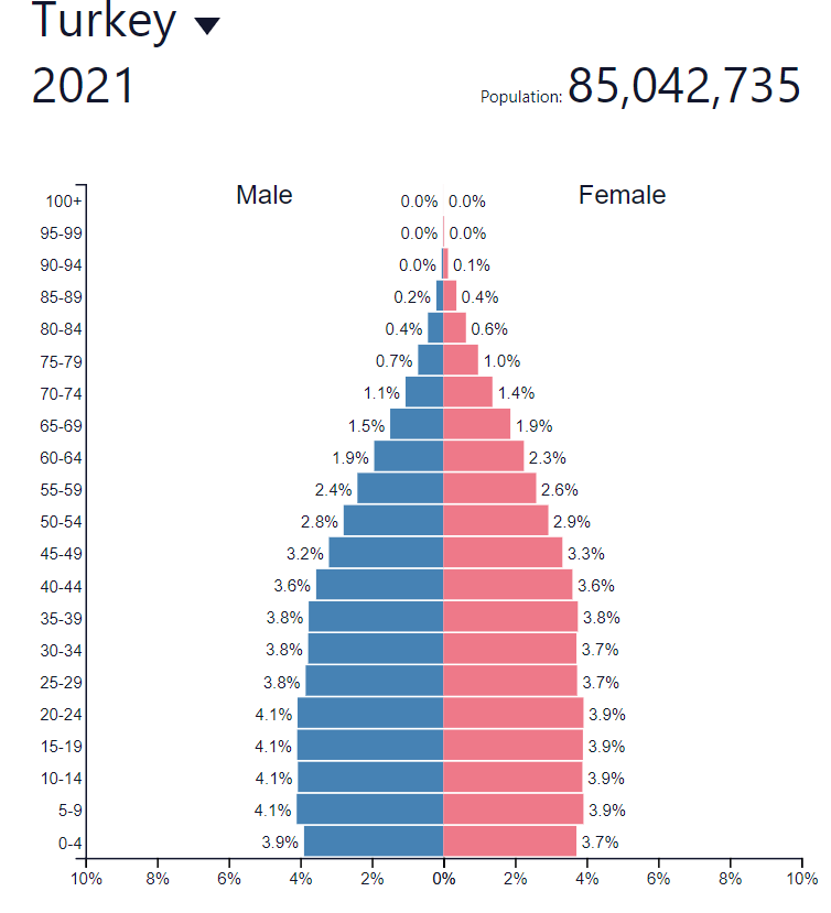 Χαρακτηριστικά, το 1950 είχε 21.408.397 πληθυσμό, ενώ το 1990 53.921.757 και το 2020 84.339.067. Σήμερα, οι ηλικίες 0-40 έτη αποτελούν το μεγαλύτερο ποσοστό επί του πληθυσμού της χώρας και ο μέσος όρος ηλικίας είναι 32,2 έτη, μικρότερος από κάθε άλλη βαλκανική κοινωνία. Ο δημογραφικός παράγοντας μπορεί να αποτελέσει σημαντικό παράγοντα για την τουρκική πολιτική. Είναι, δυνητικά, το θεμέλιο κάθε ηγεμονικής σκέψης στην περιοχή των Βαλκανίων. Αποτελεί στην ουσία καύσιμο τόσο για την οικονομική, όσο και για την στρατιωτική ανάπτυξη της χώρας.