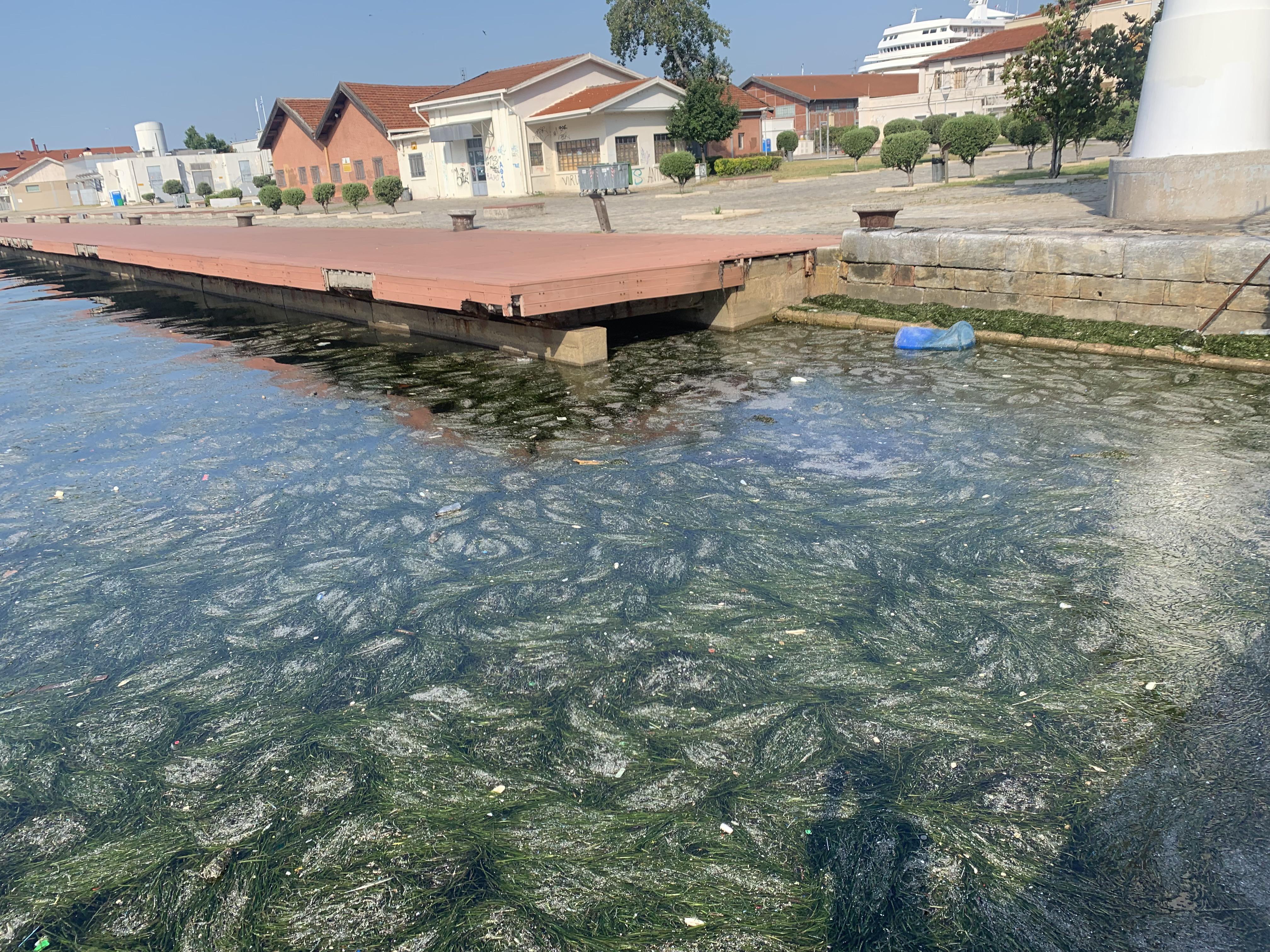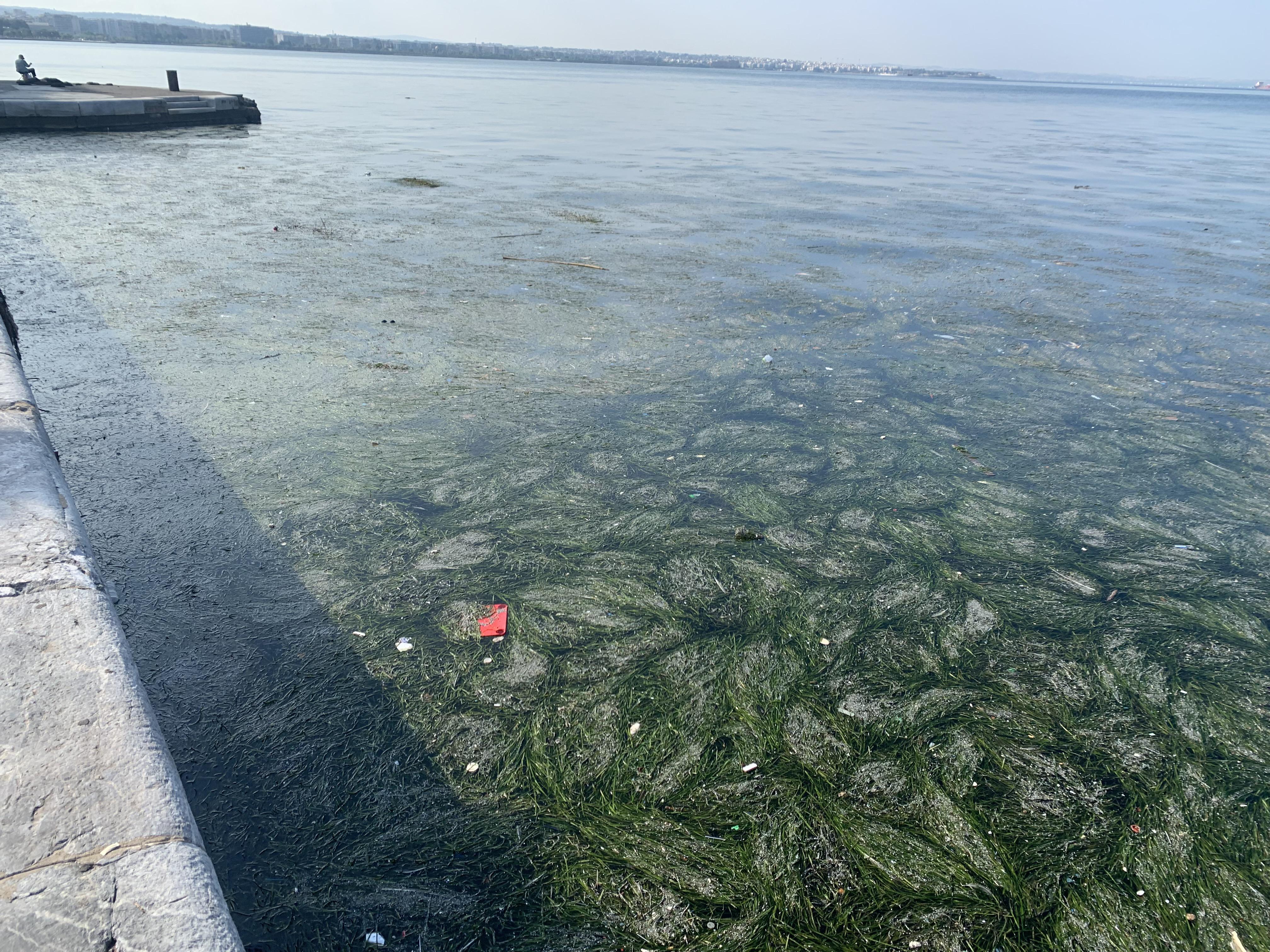 Ανησυχία προκαλεί για δεύτερη συνεχόμενη μέρα ο Θερμαϊκός κόλπος καθώς ο συνδυασμός ρευμάτων στα ανοιχτά αλλά και άπνοιας μέσα στο λιμάνι έχει ως αποτέλεσμα η επιφάνεια του νερού να είναι γεμάτη σκουπίδια, φύκια και νεκρά ζώα.