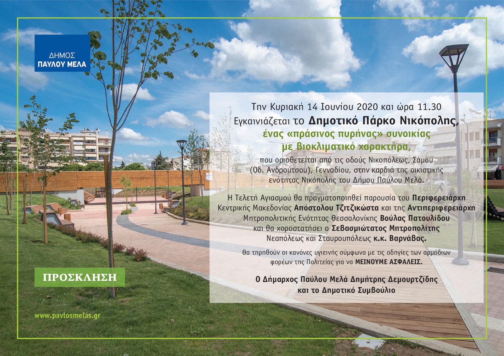 Η Κυριακή 14 Ιουνίου 2020 είναι μια ξεχωριστή ημέρα για τη Νικόπολη του Δήμου Παύλου Μελά, καθώς στις 11.30 το πρωί, παραδίδεται στους κατοίκους από τον Δήμαρχο Δημήτρη Δεμουρτζίδη και το Δημοτικό Συμβούλιο, το Δημοτικό Πάρκο Νικόπολης, ο πρώτος μεγάλος δημόσιος χώρος στην περιοχή, μετά από 50 χρόνια!