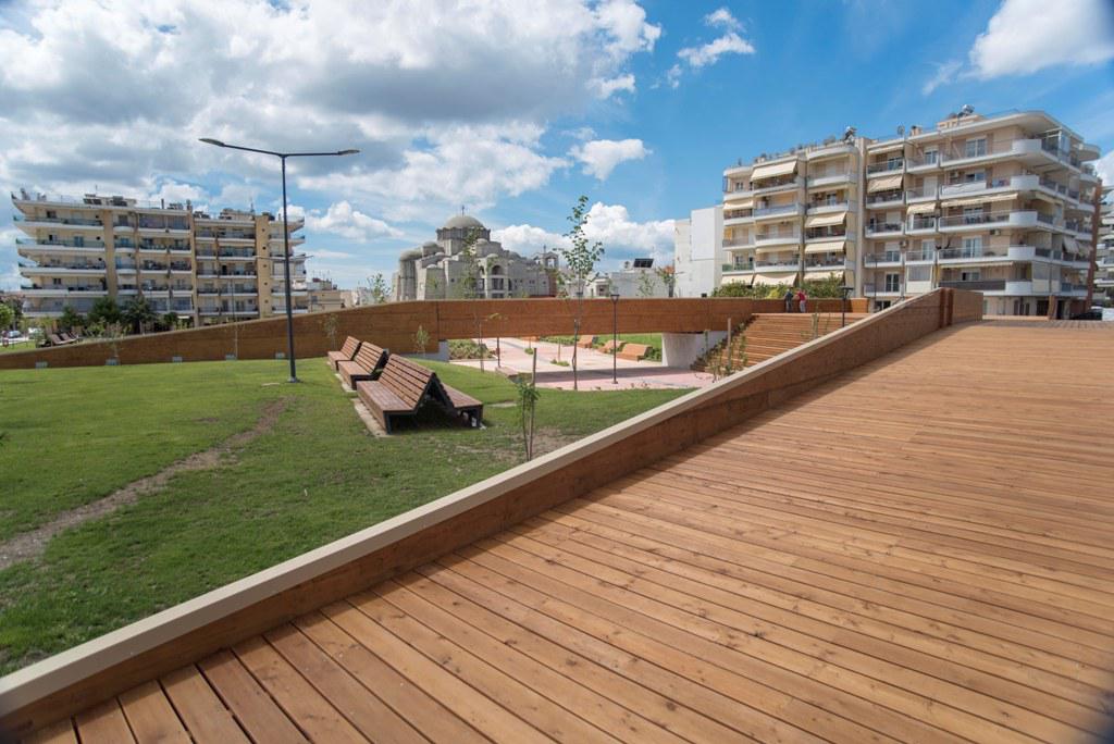 Η ιδέα του να διαμορφωθούν τρία (3) καθ ύψος επίπεδα κίνησης, ήταν η βασική αρχή του σχεδιασμού. Οι βασικοί άξονες σχεδιασμού ώστε να ολοκληρωθεί η ιδέα, ήταν η θερμική βελτίωση, η επίδραση των κατασκευών στο μικροκλίμα της περιοχής, η υδατοδιαπερατότητα. Το πρώτο επίπεδο (ενδιάμεσος χώρος), βρίσκεται στο ύψος του περιμετρικού πεζοδρομίου. Το δεύτερο επίπεδο (πάνω), βρίσκεται στο ύψος των υπερυψωμένων ξύλινων γεφυρών, οι οποίες και λειτουργούν ως επεκτάσεις των ήδη υφιστάμενων, περιφερειακών του πάρκου, διαδρομών. Στο τρίτο επίπεδο (κάτω), διαμορφώνεται μια ημιυπόγεια διάβαση, κάτω από τις ξύλινες γέφυρες, που αποδίδει στο περιβάλλον μεγάλη θερμική βελτίωση, λόγω των ρευμάτων του αέρα που δημιουργούνται με τις διαφορετικές υψομετρικές διαφορές. Στόχος του σχεδιασμού, ήταν η δημιουργία ποικίλων οπτικών γωνιών αλλά και χώρων, διαφορετικών μεταξύ τους, εντείνοντας έτσι την πολυμορφία, πολυχρησία και ενισχύοντας τα ερεθίσματα στους κατοίκους και τους επισκέπτες. Ερεθίσματα που έχουν να κάνουν με τις οπτικές, τη σκιά, το φως, την εναλλαγή του φυσικού τοπίου, αποκλειστικά στηριγμένο στα βασικά φυτικά είδη της χώρας μας.