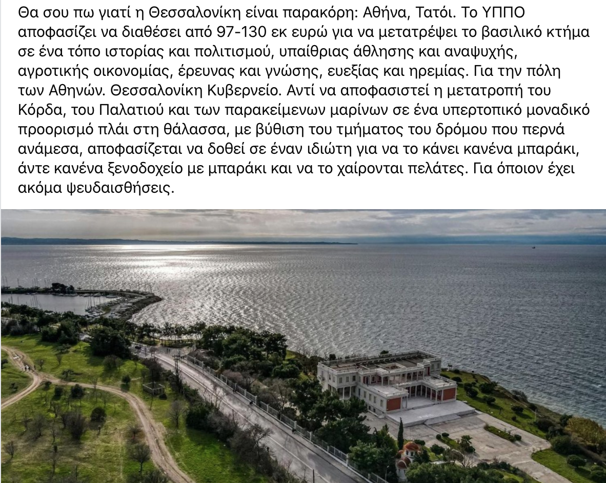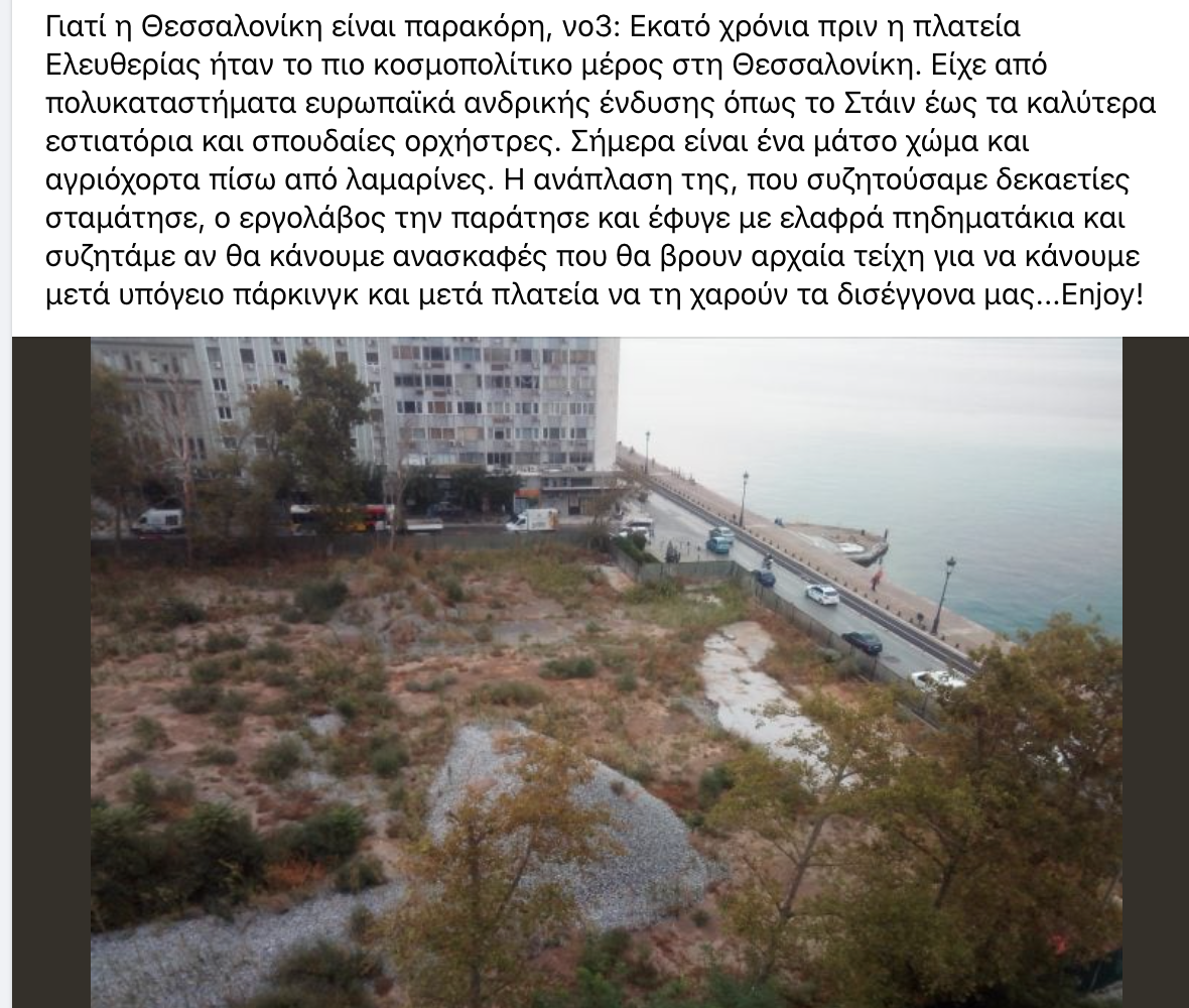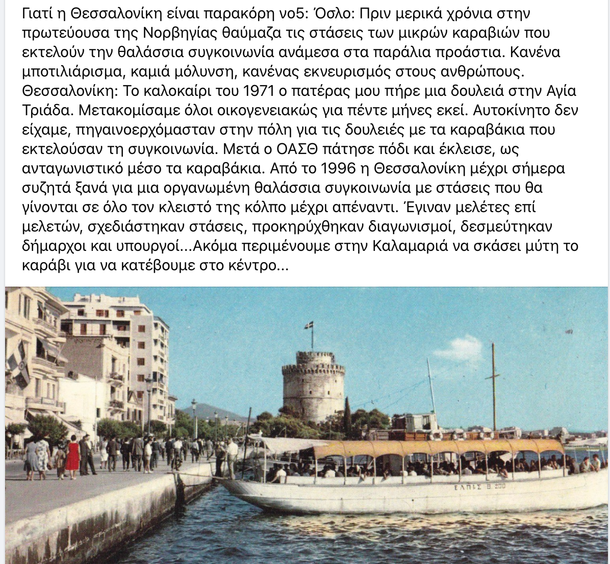 Καταληκτικά, και επειδή ως Θεσσαλονικιός δεν αισθάνομαι καθόλου «ψυχοπαίδι» ούτε στην πόλη μου ούτε στη χώρα μου, αλλά πονώ κι εγώ βλέποντας την εικόνα της εγκατάλειψης σε διάφορα επίπεδα (συμφωνώντας με της επισημάνσεις των αναρτήσεων του Τούλα) αναρωτιέμαι πόσο διαφορετική θα ήταν η εικόνα της εάν είχε η ίδια αναζητήσει λύσεις στα προβλήματά της με άλλες επιλογές και αξιοποιώντας το δυναμικό της σε τοπικό και περιφερειακό επίπεδο.