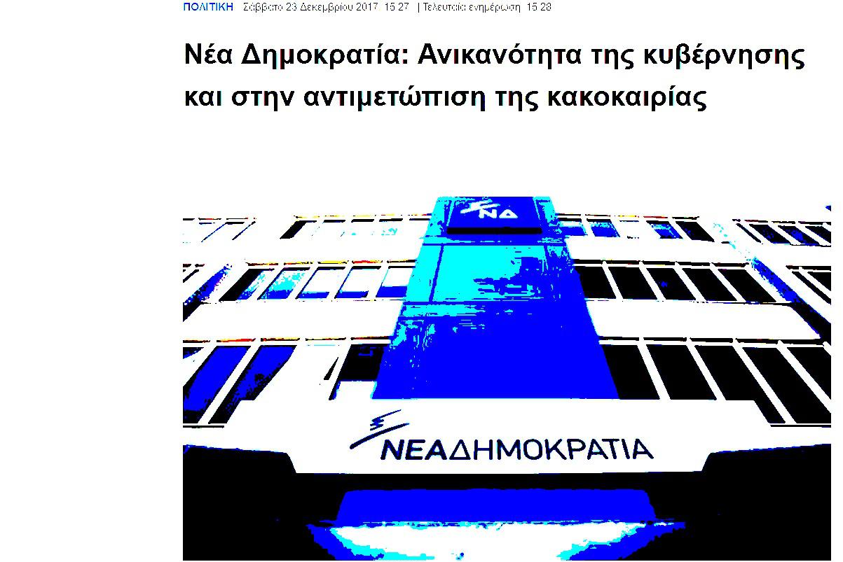 Θα μπορούσε να είναι σημερινή ανακοίνωση του ΣΥΡΙΖΑ αλλά δεν είναι. Είναι η ανακοίνωση της Νέας Δημοκρατίας με ημερομηνία 23 Δεκεμβρίου του 2017 και με αφορμή χιονόπτωση σε μεγάλο μέρος της χώρας. Σήμερα που η Νέα Δημοκρατία είναι στην κυβέρνηση, οι αιτίες για τις οποίες αντιμετωπίζει η χώρα τόσα προβλήματα, είναι άλλες και σίγουρα ΟΧΙ Η ΑΝΙΚΑΝΟΤΗΤΑ.