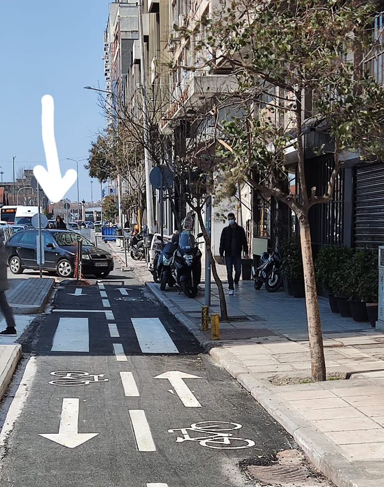 Με κράσπεδο και νησίδα προστασίας, νέα άσφαλτο, που θα μπορούσε βέβαια να βαφτεί σε άλλο χρώμα όπως για παράδειγμα στη Λάρισα, ειδικές πινακίδες στην είσοδο με ζωγραφισμένα ποδήλατα, για σηματοδότηση, δημιουργούν για τον ποδηλάτη ή τον οδηγό του πατινιού επιτέλους ένα αίσθημα ασφάλειας και σοβαρότητας.