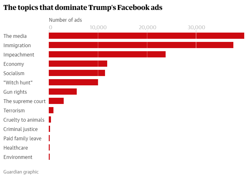 Εάν προσπαθήσατε να εξαγάγετε τα προβλ’ηματα που έχουν μεγαλύτερη σημασία στους Αμερικανούς ψηφοφόρους από τις διαφημίσεις του προέδρου Facebook, θα πιστεύατε ότι η νούμερο ένα ανησυχία για τους ψηφοφόρους δεν είναι η υγειονομική περίθαλψη (όπως δείχνει η μία δημοσκόπηση μετά την άλλη), αλλά οι υποτιθέμενες κακοποιήσεις των mainstream media. Τα μέσα μαζικής ενημέρωσης και τα «fake news» αναφέρονται στο 18,25% των διαφημίσεων του Τραμπ το 2019 – περισσότερο από οποιοδήποτε άλλο θέμα. Το κύριαρχο θέμα του Trump – η μετανάστευση και ένας τοίχος στα σύνορα – έρχεται δεύτερος, ακολουθούμενος από τη μομφή, την οικονομία, τα δικαιώματα των όπλων και το ανώτατο δικαστήριο.