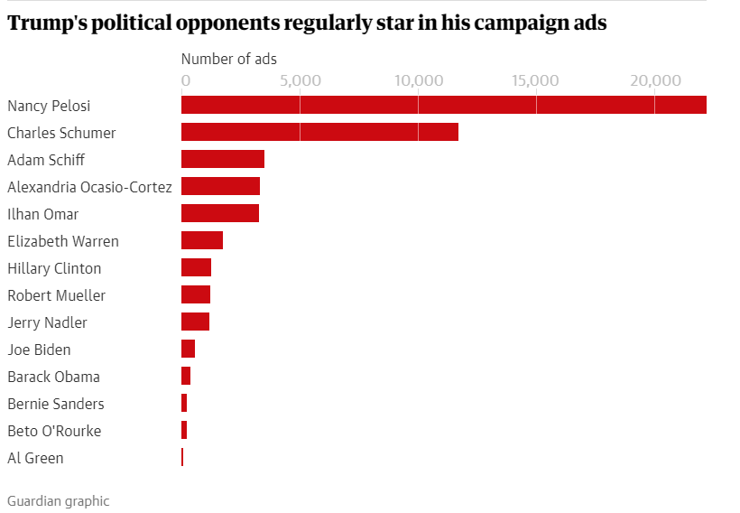 Οι πολιτικοί εχθροί και τα παράπονα είναι ένα κοινό χαρακτηριστικό των διαφημίσεων του Τραμπ. Η εκστρατεία έτρεξε 10 φορές περισσότερες διαφημίσεις που αναφέρουν τη φράση “κυνήγι μαγισσών” ως διαφημίσεις που αναφέρουν την τρομοκρατία. Άλλες τόσες διαφημίσεις προειδοποιούν κατά του “σοσιαλισμού” ως διαφημίσεις για τασχέδιά του για το εμπόριο ή την οικονομία.