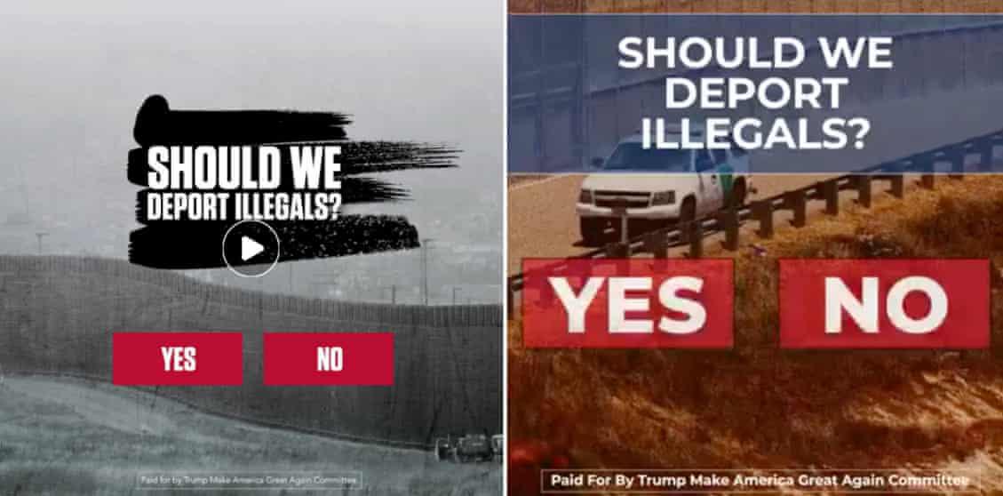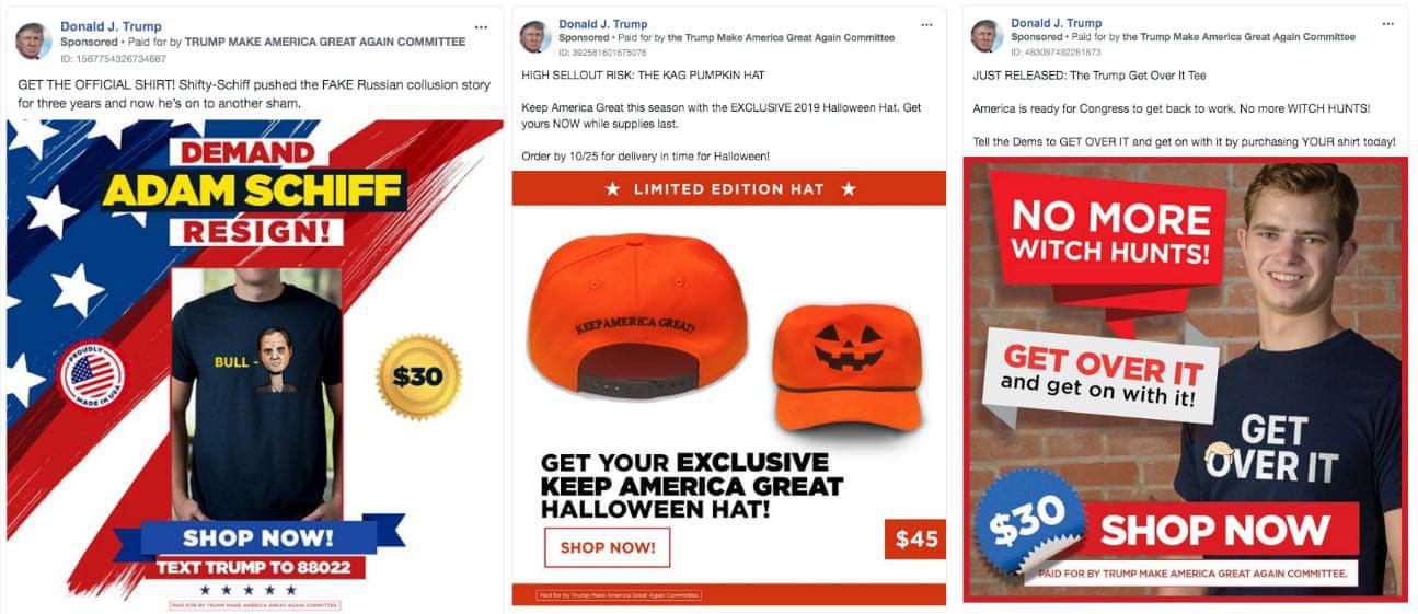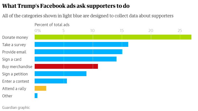 Οι διαφημίσεις Facebook έχουν σχεδιαστεί για να προωθούν τις ενέργειες στο διαδίκτυο και σχεδόν όλες οι διαφημίσεις της καμπάνιας Trump προορίζονται σαφώς να παράγουν ένα από τα τέσσερα: δωρεά χρημάτων, παρακολούθηση ομιλίας, αγορά αγαθών καμπάνιας ή παροχή της καμπάνιας με διεύθυνση ηλεκτρονικού ταχυδρομείου χρήστη ή αριθμό κινητού τηλεφώνου .
