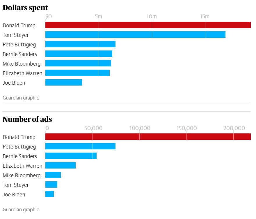 Στο Facebook, ο Τραμπ ξεπερνά κατά πολύ σε προϋπολογισμό τους Δημοκρατικούς αντιπάλους του. Ο υποψήφιος Δημοκρατικός, Tom Steyer, δαπάνησε 16,8 εκατομμύρια δολάρια σε μόλις 12.704 διαφημίσεις στην πλατφόρμα κατά τη διάρκεια του έτους. Ο πρώην δήμαρχος του South Bend, Indiana, Pete Buttigieg πλησίασε περισσότερο τον όγκο διαφημίσεων του Trump, με 74.286 διακριτές διαφημίσεις.
