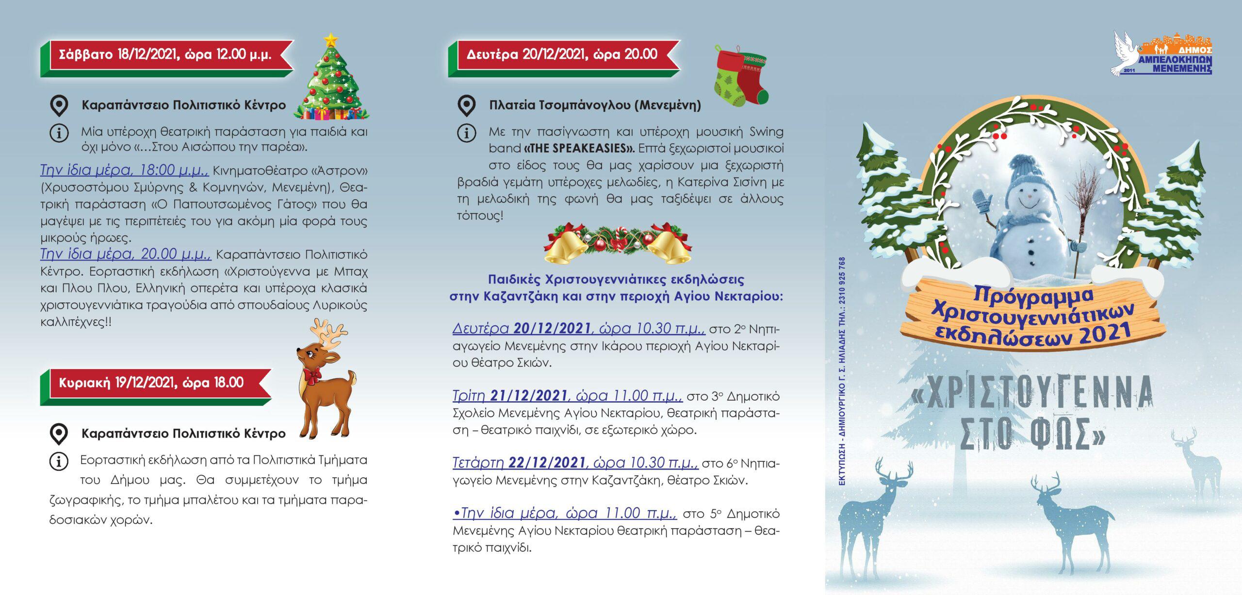 Με το παραπάνω σύνθημα και τον δήμο να έχει ήδη φωταγωγηθεί με λαμπιόνια και χριστουγεννιάτικα στολίδια, Αμπελόκηποι και Μενεμένη έχουν μπει τις τελευταίες ημέρες σε εορταστικούς ρυθμούς, ενώ στις 15/12 ακολουθεί και το άναμμα του δέντρου στην πλατεία Επταλόφου στις 19:00.