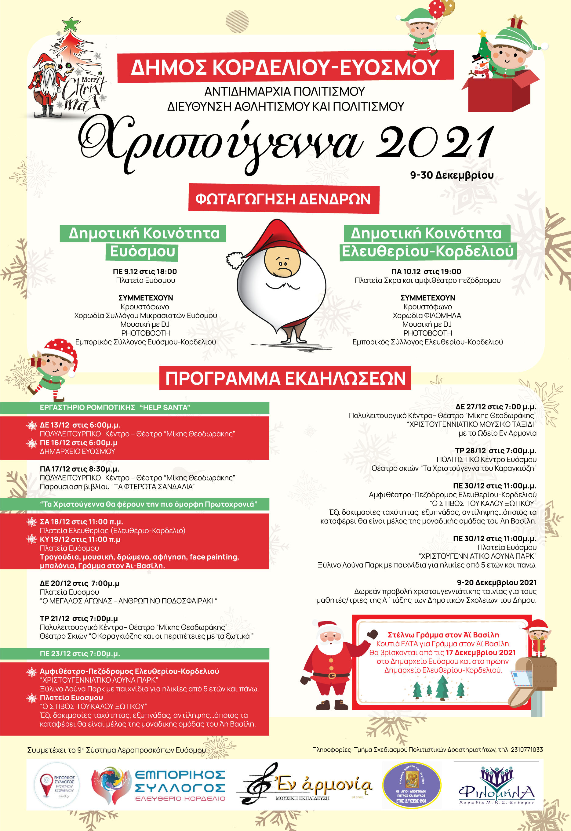 Με ένα «πολύχρωμο» πρόγραμμα με ψυχαγωγικά και μουσικά δρώμενα, δημιουργικές δραστηριότητες και παιχνίδια ο Δήμος Κορδελιού Ευόσμου υποδέχεται τα Χριστούγεννα, προσκαλώντας μικρούς και μεγάλους να δώσουν το παρόν τους στις φετινές εορταστικές εκδηλώσεις.
