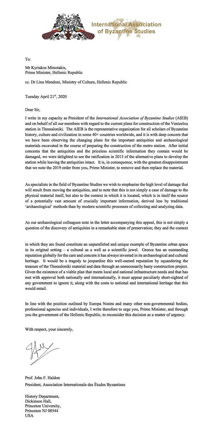 Η Διεθνής Ένωση Βυζαντινών Σπουδών δια του πρόεδρου της, Καθηγητή στο Πρίνστον, John F. Haldon, στέλνει επιστολή προς τον πρωθυπουργό κ. Κ. Μητσοτάκη για τη διάσωση των Αρχαιοτήτων του Σταθμού Βενιζέλου. Η επιστολή της ολομέλειας του ΔΣ της Ένωσης ελήφθη μετά από εισήγηση του Τμήματος Βυζαντινής Αρχαιολογίας της Διεθνούς Ένωσης Βυζαντινών Σπουδών, επικεφαλής του οποίου είναι ο Καθηγητής Α. Vionis. Η επιστολή απεστάλη χθες 21-4-2020 απευθείας προς τον πρωθυπουργό κ. Κ. Μητσοτάκη με κοινοποίηση στην υπουργό Πολιτισμού κ. Λ. Μενδώνη.