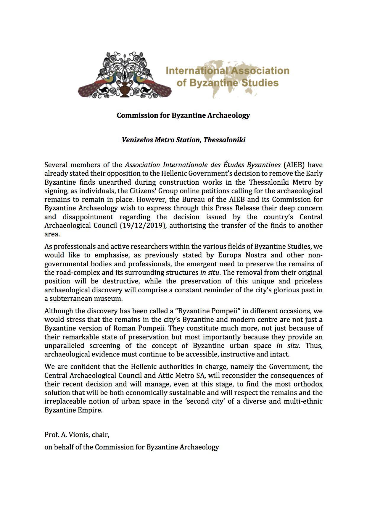 Σας γράφω από τη θέση μου, ως Προέδρου της Διεθνούς Ένωσης Βυζαντινών μελετών (ΑΙΕΒ) και εκ μέρους όλων των μελών της, σε σχέση με τα υπάρχοντα σχέδια για την κατασκευή του σταθμού Βενιζέλου στη Θεσσαλονίκη.