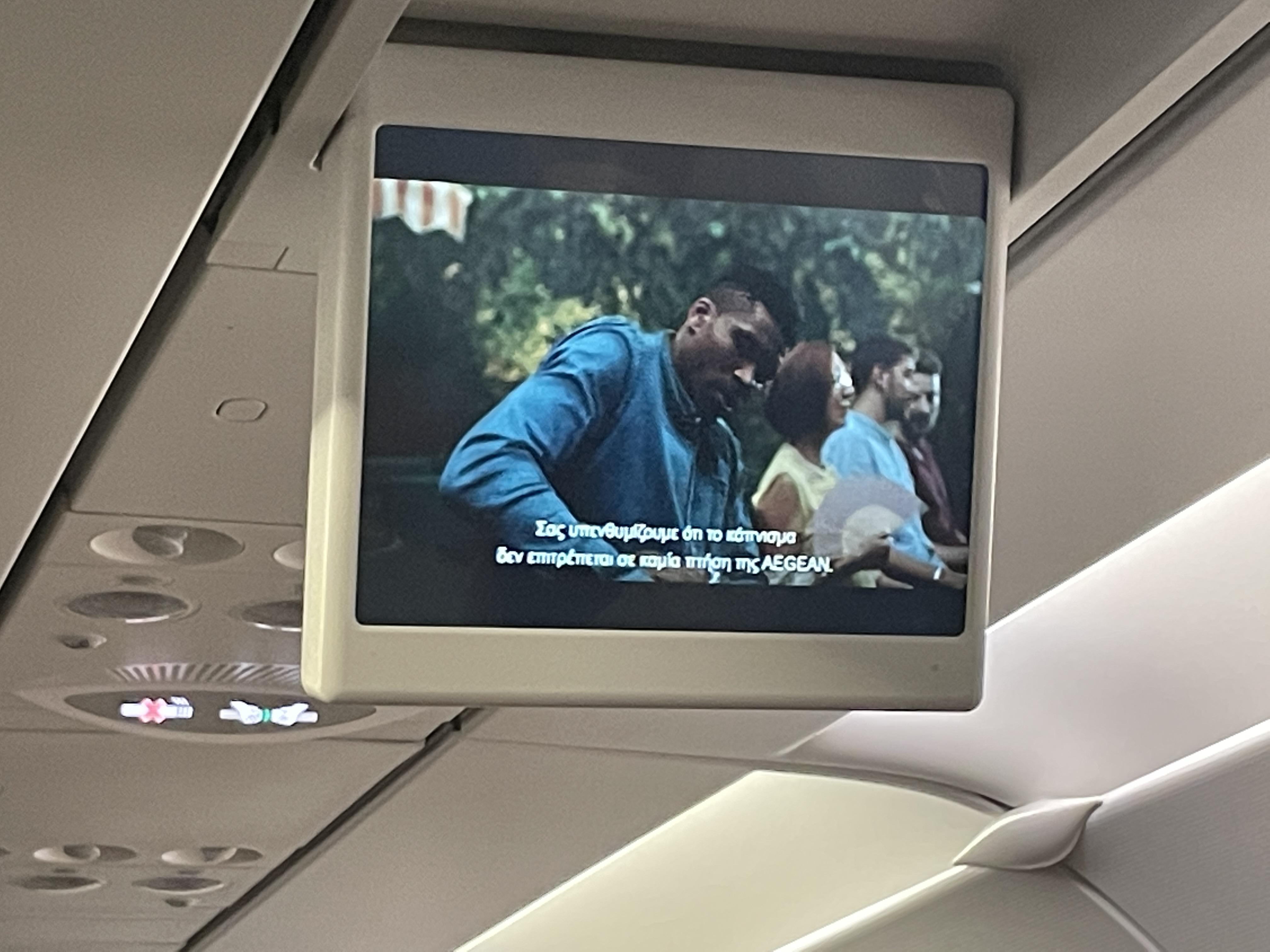 Ο πιλότος καλωσορίζει τους επιβάτες του και ενώ περιμένεις live τις οδηγίες, πέφτουν οι μικρές ατομικές οθόνες και ξεκινάει ένα βίντεο που παίζει δυο φορές μια στα Ελληνικά και μια στα Αγγλικά.